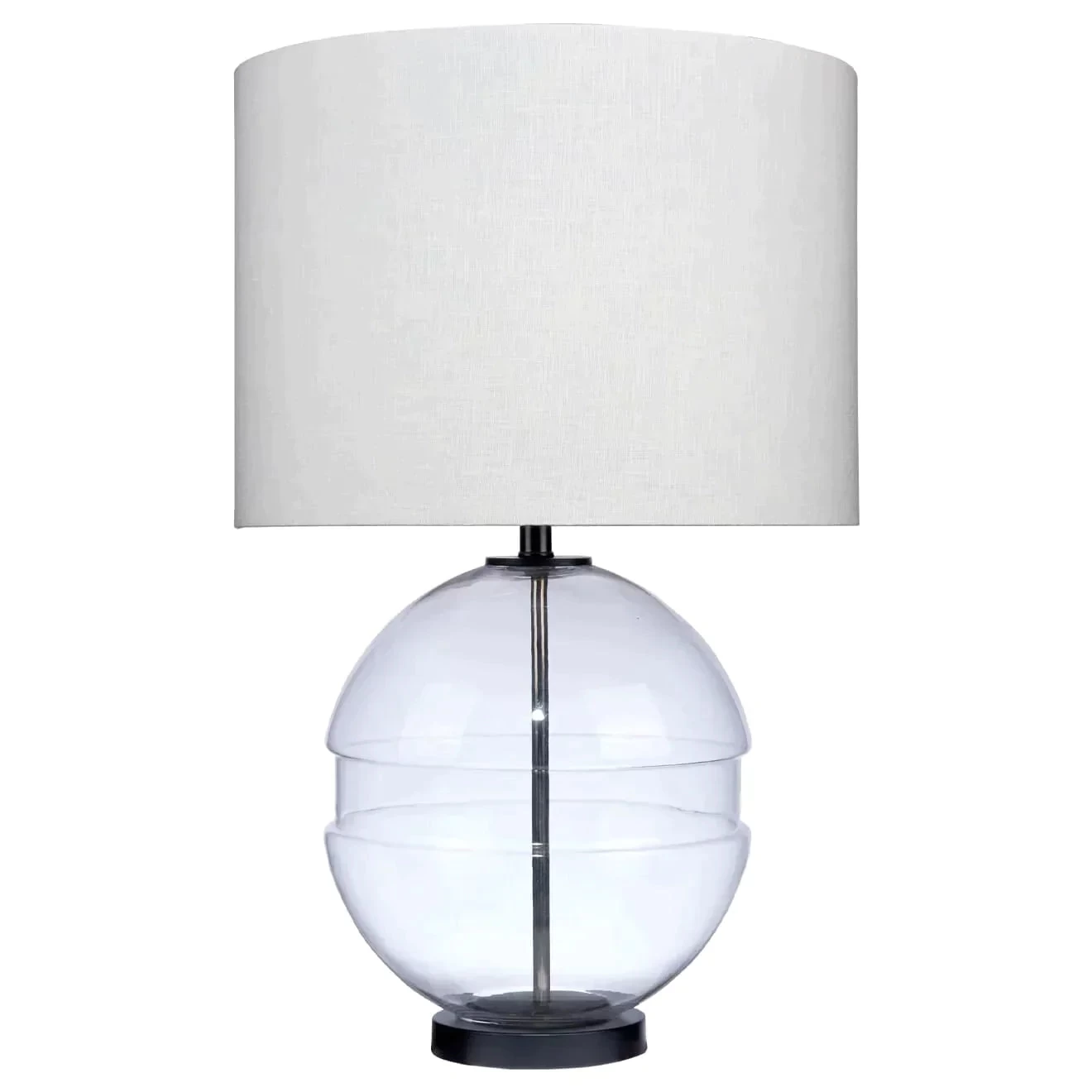 Metal and glass combine to create a table lamp that is both bold and delicate, from its black metal base to its matching finial. The clear spherical glass surrounding the iron axis of the lamp is like a celestial body in orbit. This table lamp is both simple and sophisticated and finds itself at home on a console, living room table, dining buffet, or anywhere else that needs a touch of uniquely elegant decor.