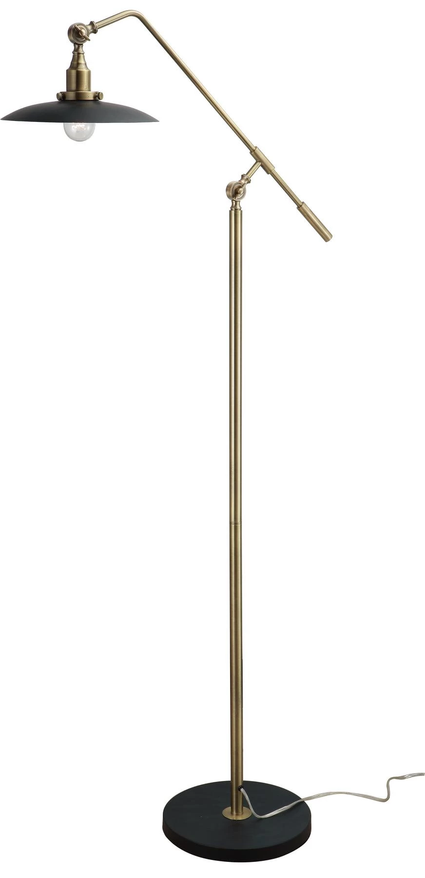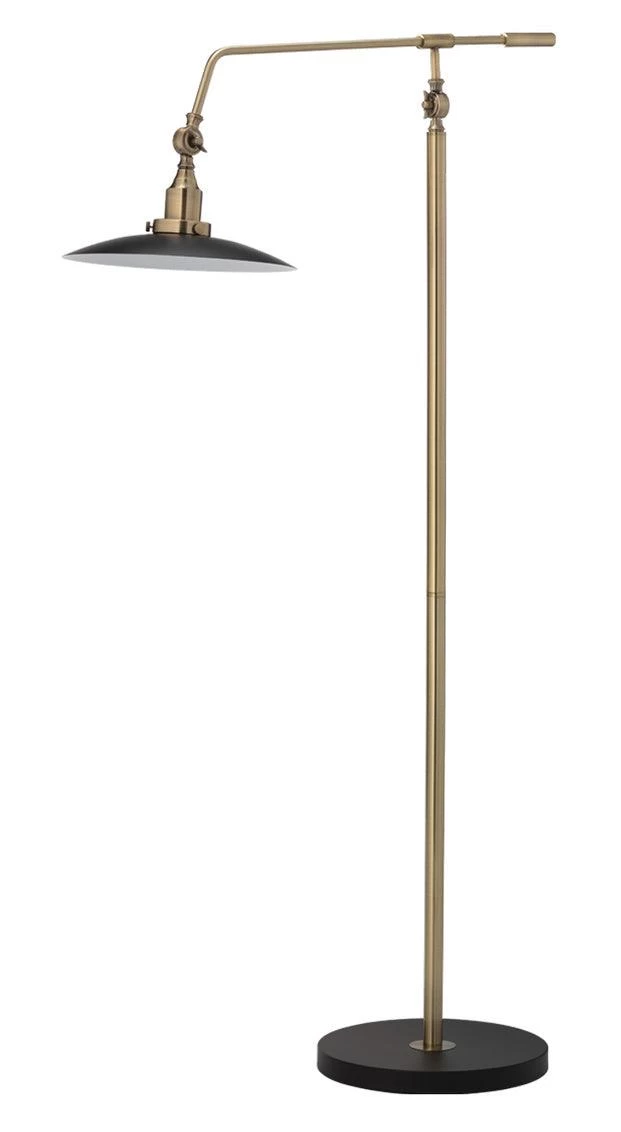 This mid-century Modern adjustable floor lamp shines in antique brass. Ships Knock Down. On/Off floor switch. Adjustable height from 50 inches to 65 inches.