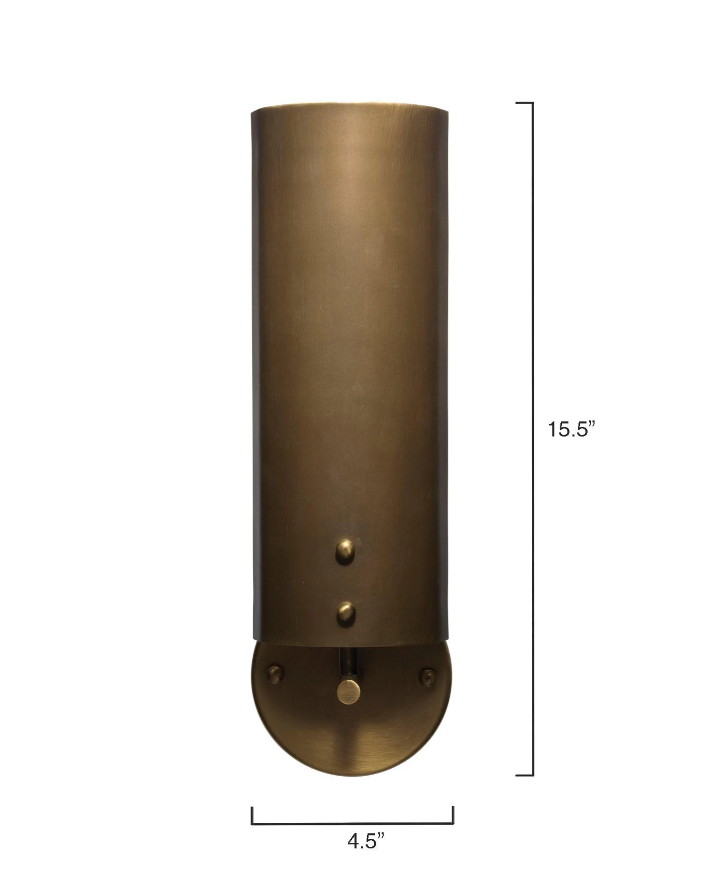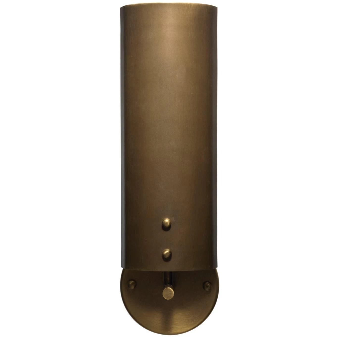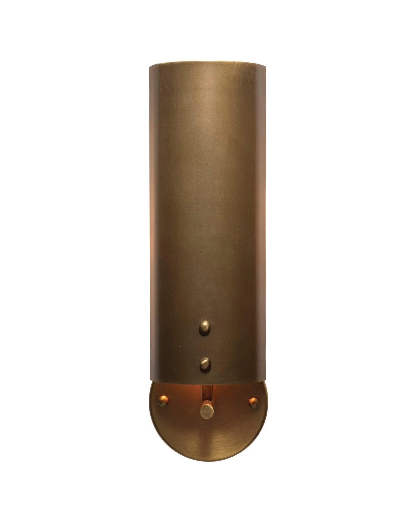 This wall sconce casts a rich low light in a corridor or hall way with a satin metal finish in antique brass