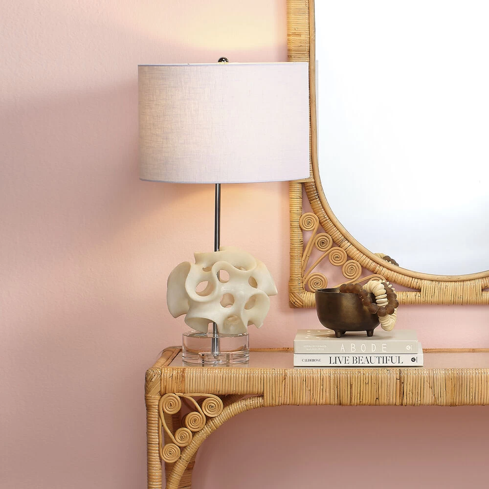 Ribbons of white resin swirl organically into seemingly random but perfectly balanced shapes in this unique table lamp. Inspired by the chunks of coral that can be found on the pristine white beaches of the Bahamas, our coastally influenced sculpture wraps around a simple metal rod body with a bright nickel finish. A substantial acrylic base anchors it all; a rolled edge linen drum shade and coordinating silver hardware add refinement.