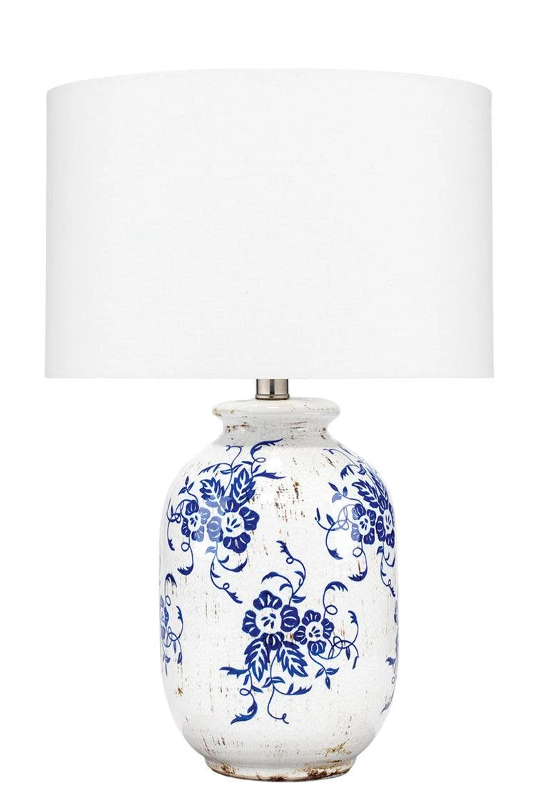 This antiqued blue and white ceramic table lamp with hand applied glaze and vintage floral pattern is a statement maker in any room