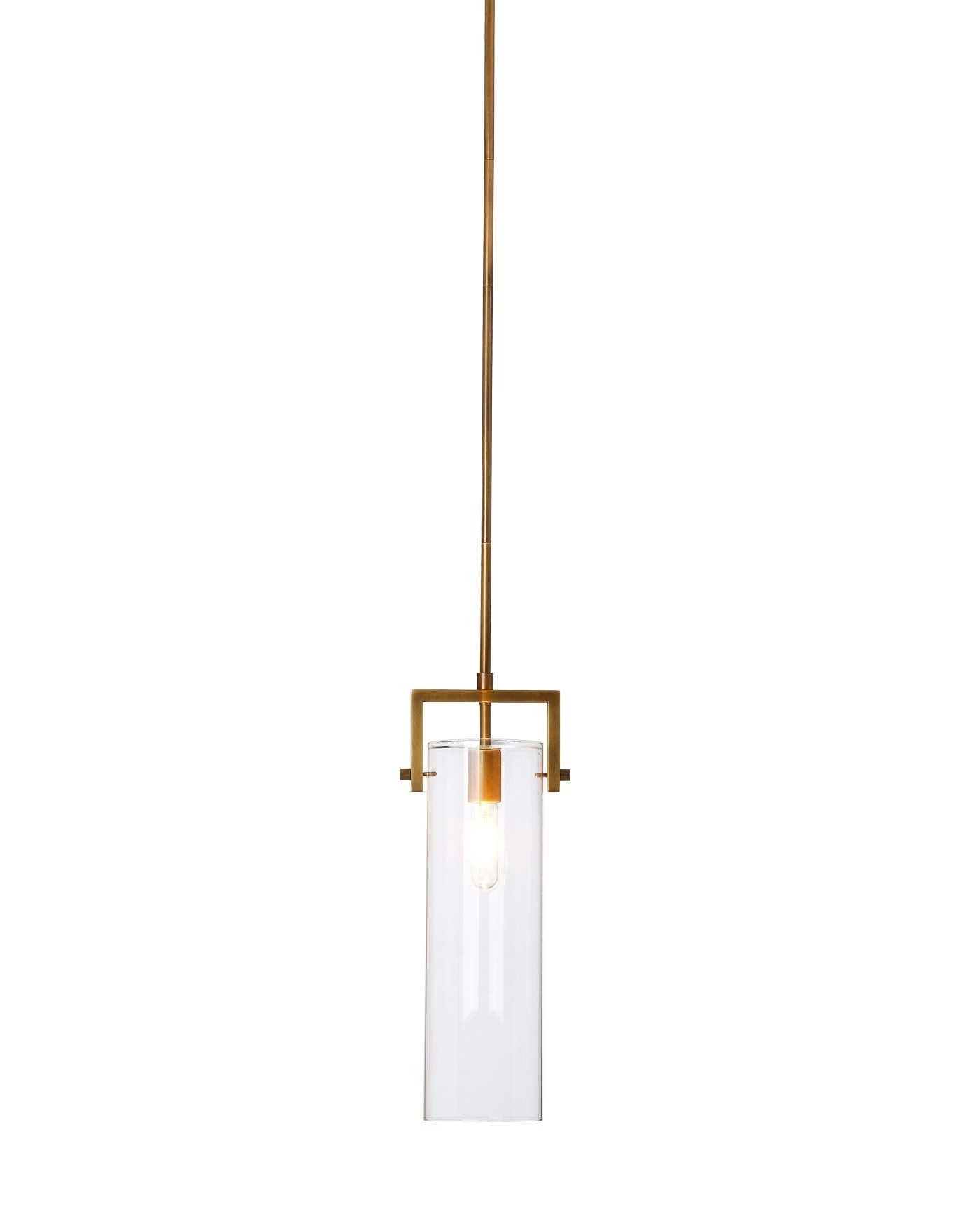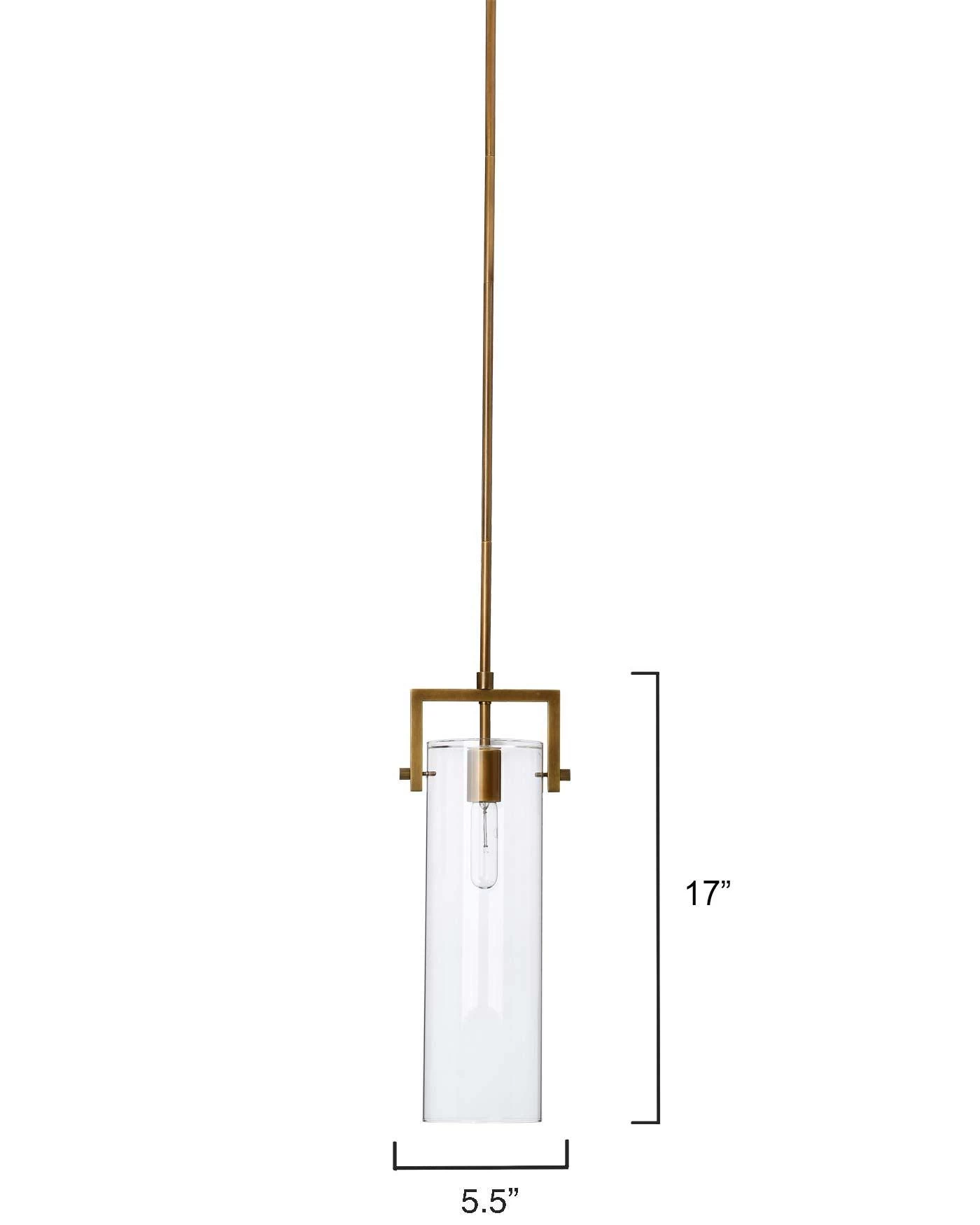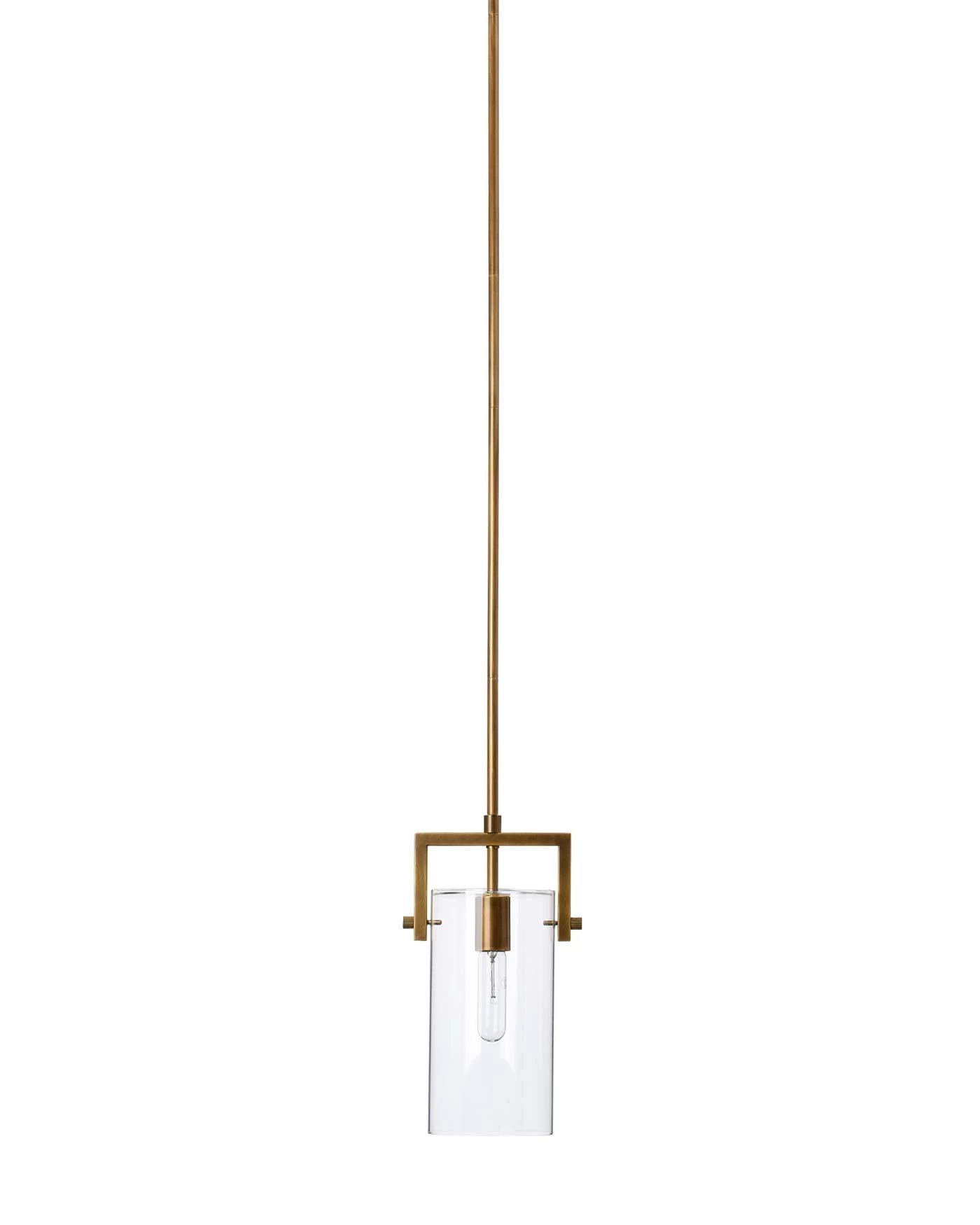 This linear pendant’s sleek glass cylinder is suspended by an antique brass rod and structure. Evoking both Modern and industrial notes, the glass cylinder allows the bulb to freely shine, beautifully illuminating a room. Consider using two to flank a mirror or hang a cluster above your kitchen island or dining room table for a chic, stylish look. The fixture is suspended from a coordinating 5′ max adjustable antique brass rod, and professional installation is recommended.