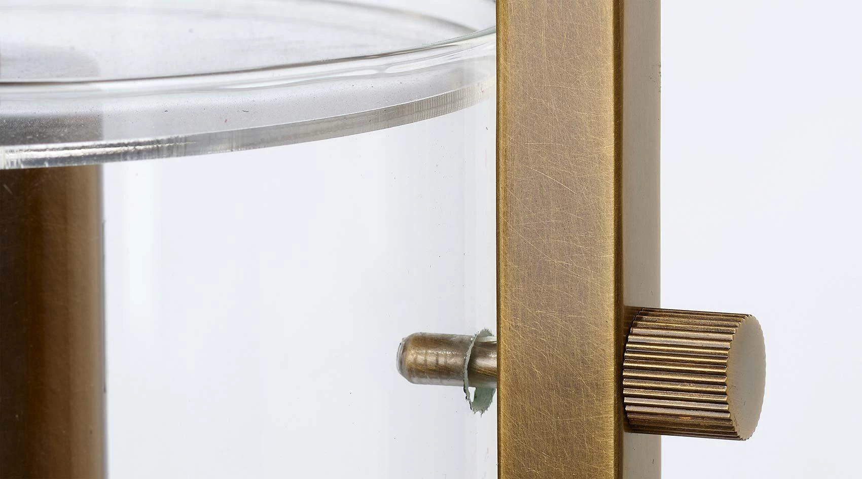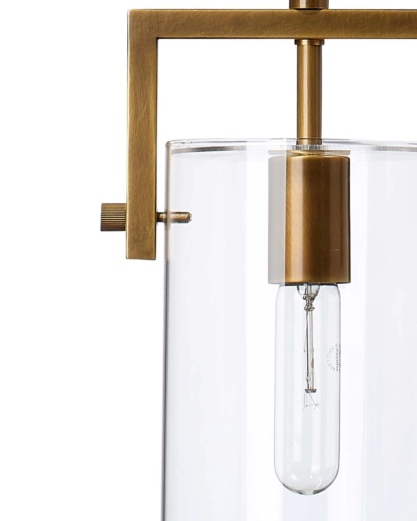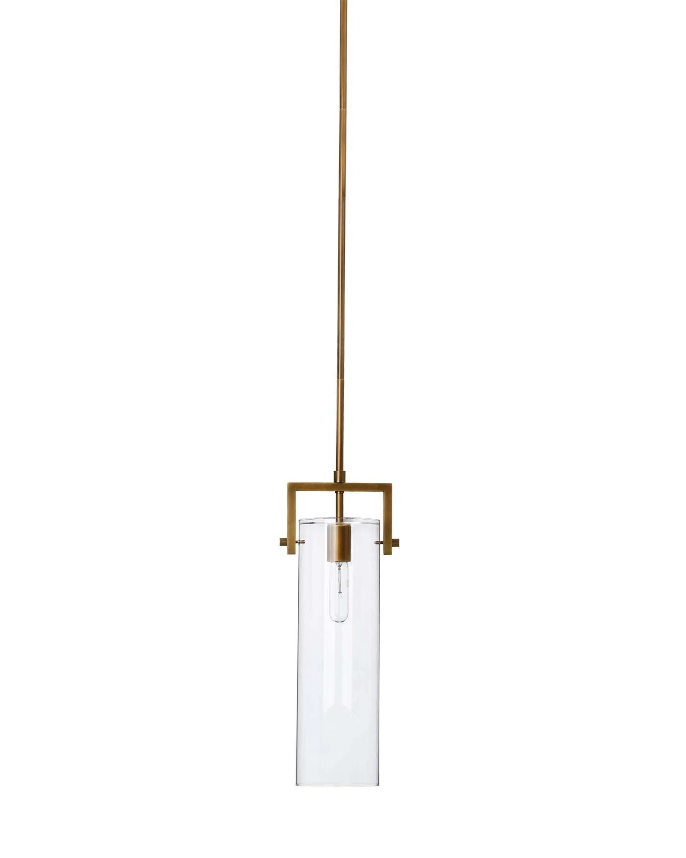 This linear pendant’s sleek glass cylinder is suspended by an antique brass rod and structure. Evoking both Modern and industrial notes, the glass cylinder allows the bulb to freely shine, beautifully illuminating a room. Consider using two to flank a mirror or hang a cluster above your kitchen island or dining room table for a chic, stylish look. The fixture is suspended from a coordinating 5′ max adjustable antique brass rod, and professional installation is recommended.