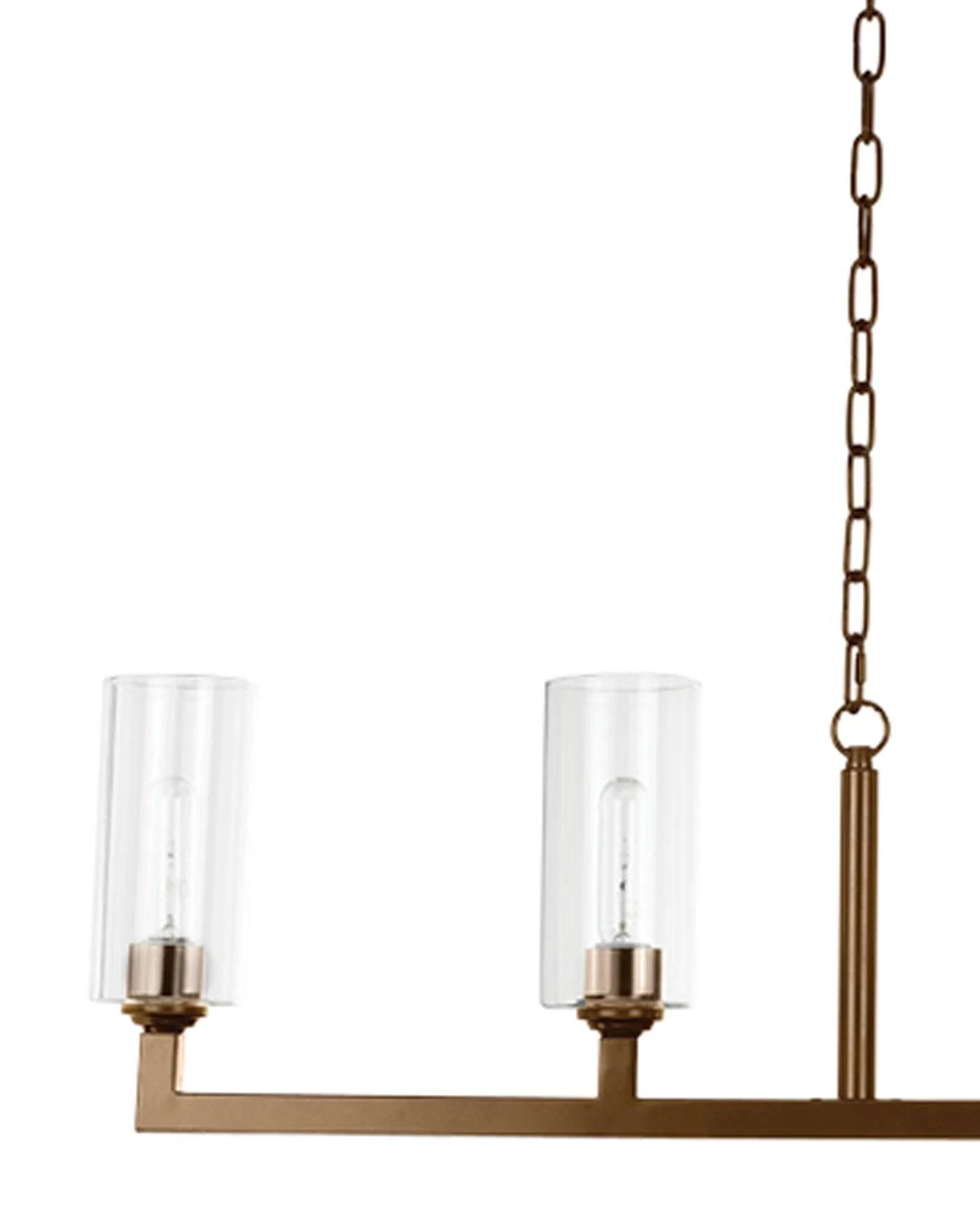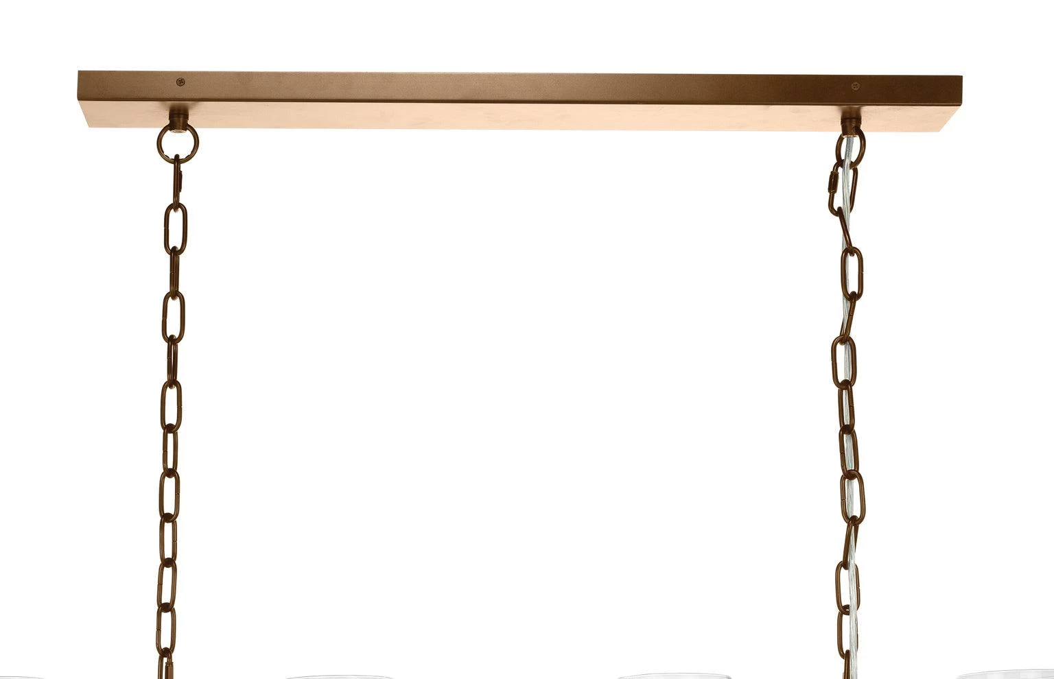 The stylish angles of the Linear 6 Light Chandelier provide a warm illumination that highlights any bar, counter or dining room elegantly. This hanging fixture Modern izes the classic vintage torchier with clear glass shades and metallic chain link hardware.
