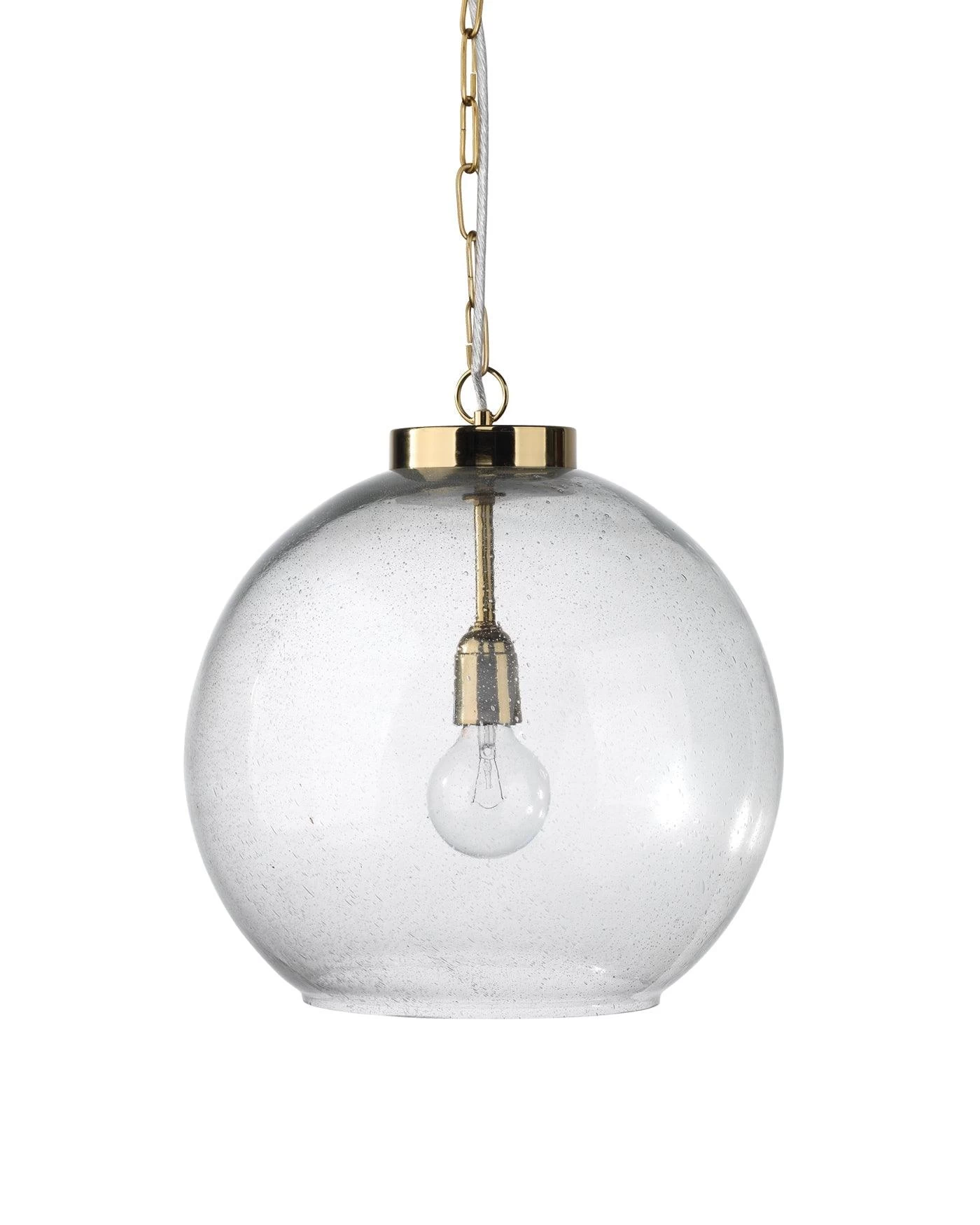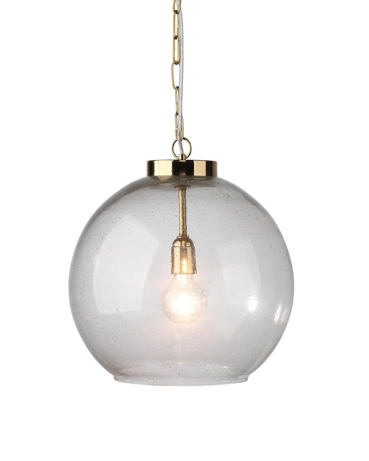industrial Modern loft style pendant with a mouth blown seeded glass globe. Antique brass finish hardware