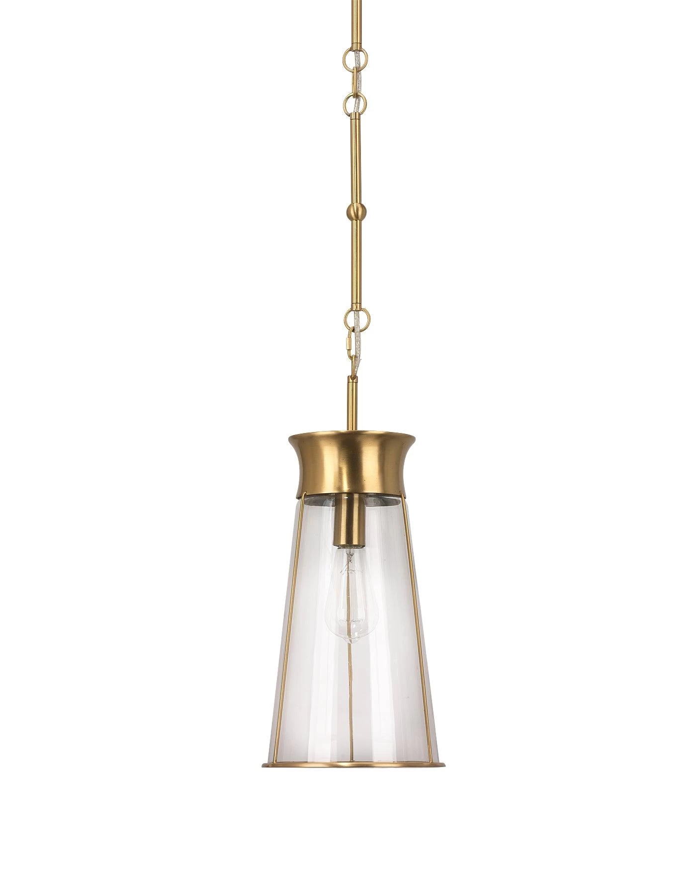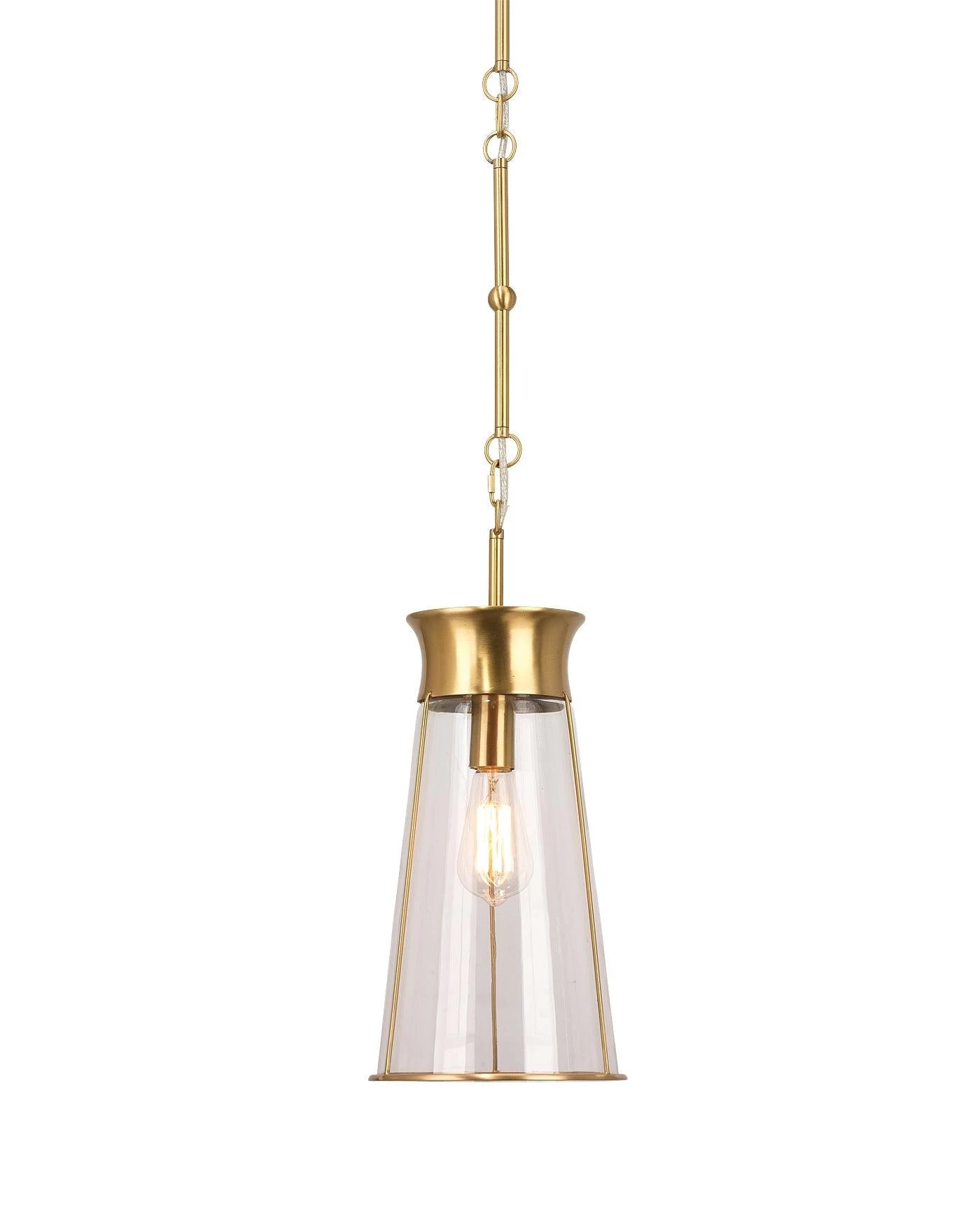Clear glass, accented with antique brass metal makes this pendant an easy choice for any environment. Framed in metal, the glass adapts to any paint color or wallpaper. The simplicity of this pendant is accented only by the delicate detail of the chain.