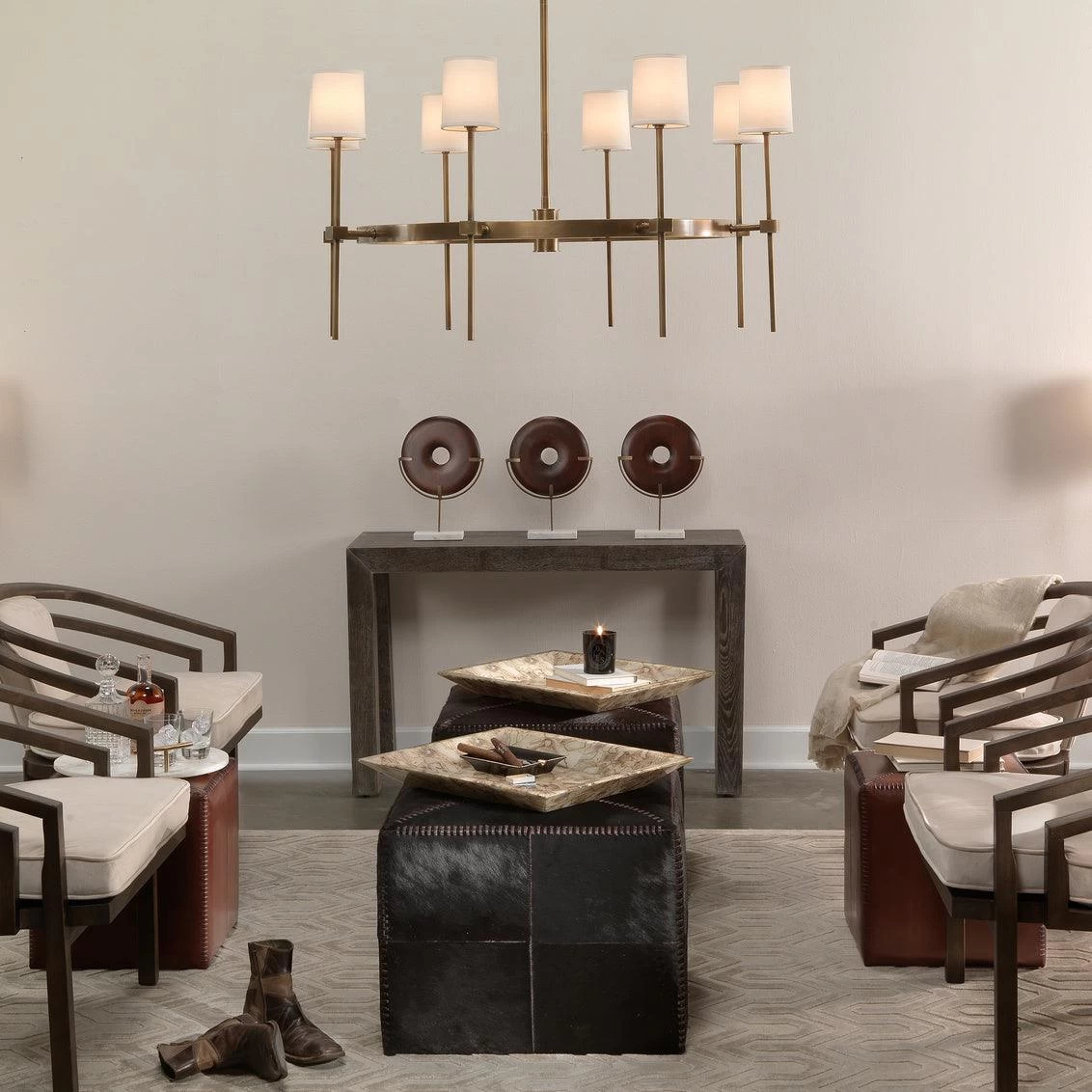A striking eight-light chandelier with a multi-arm metal frame in warm antique brass. The Minerva 8 Light Chandelier offers an eye-catching appeal that was inspired by mid-century Modern style.