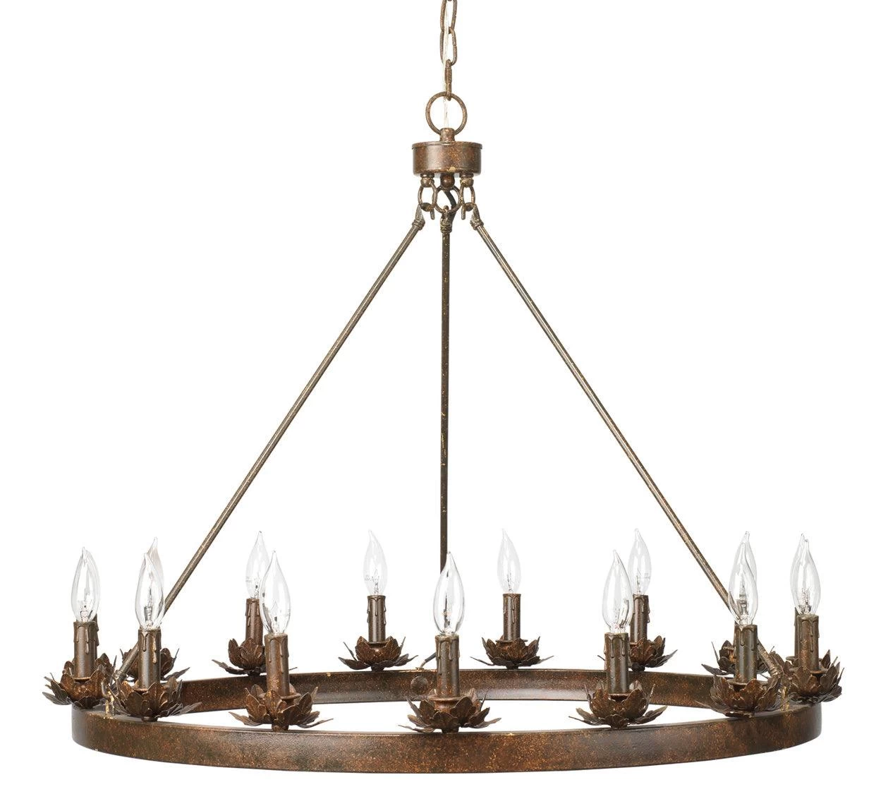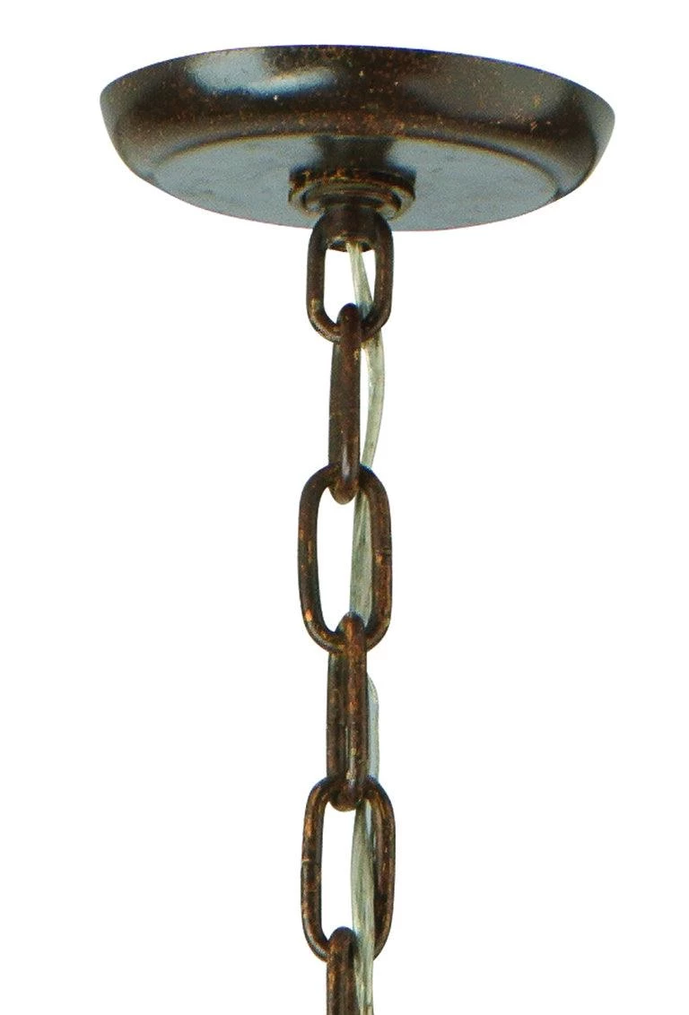 40 inches rust iron chain with clear cord. 5 inches diameter rust iron ceiling plate. Rustic and strong this pendant is a perfect marriage of old and new world styles.