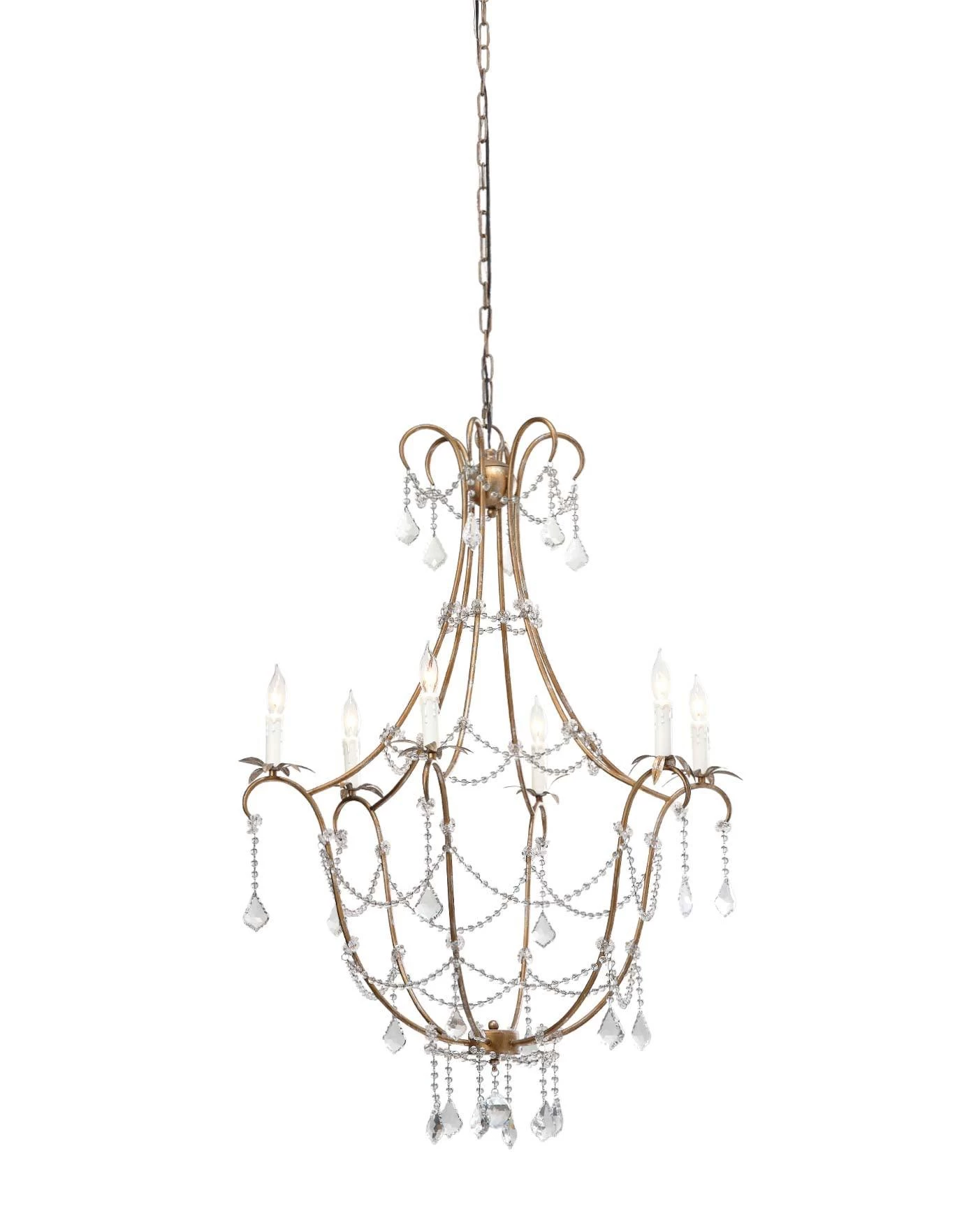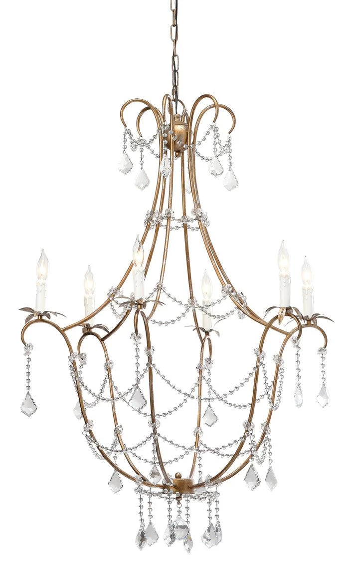 This large chandelier screams “Glamorous” from the tip of the champagne ironwork to the ends of the cut crystal jewels dripping below. Chains of crystal beading are woven and draped among the scrolling structure and include over twenty dangling crystal jewels. Six faux dripping candles are perched in iron blooms, giving this fixture a subtle botanical touch. This chandelier will bring a touch of delicate drama to your dining room, bedroom, or entryway. The fixture is suspended from a coordinating 8-foot chain in champagne, and professional installation is recommended.