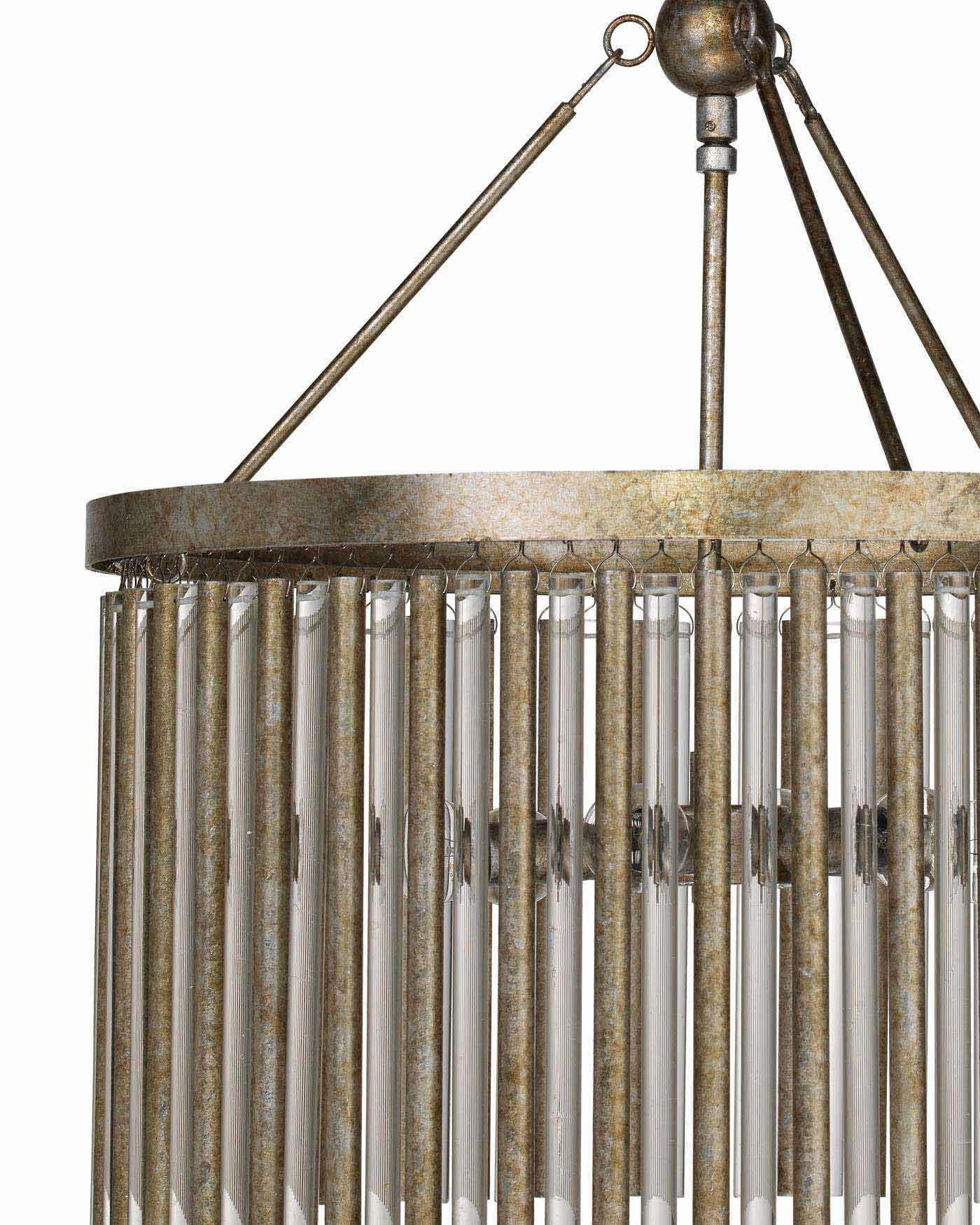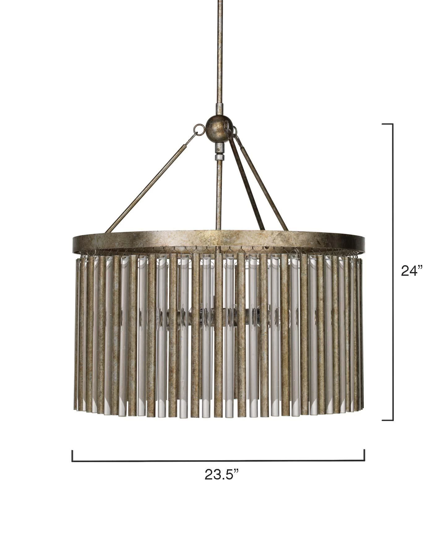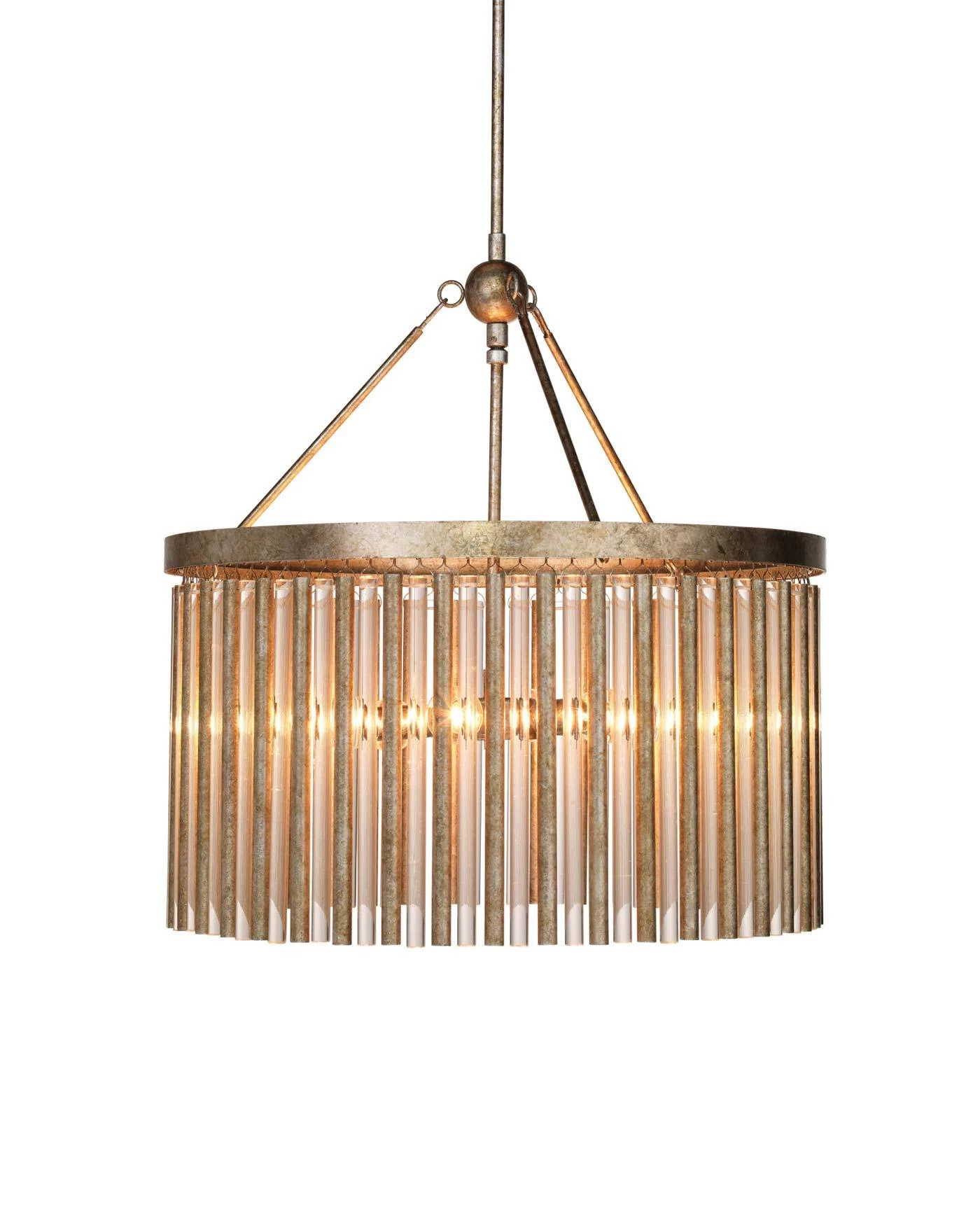 This elegant round chandelier has alternating tubes of glass and metal to create a statement piece. The frame and tubes are finished in a champagne leaf.