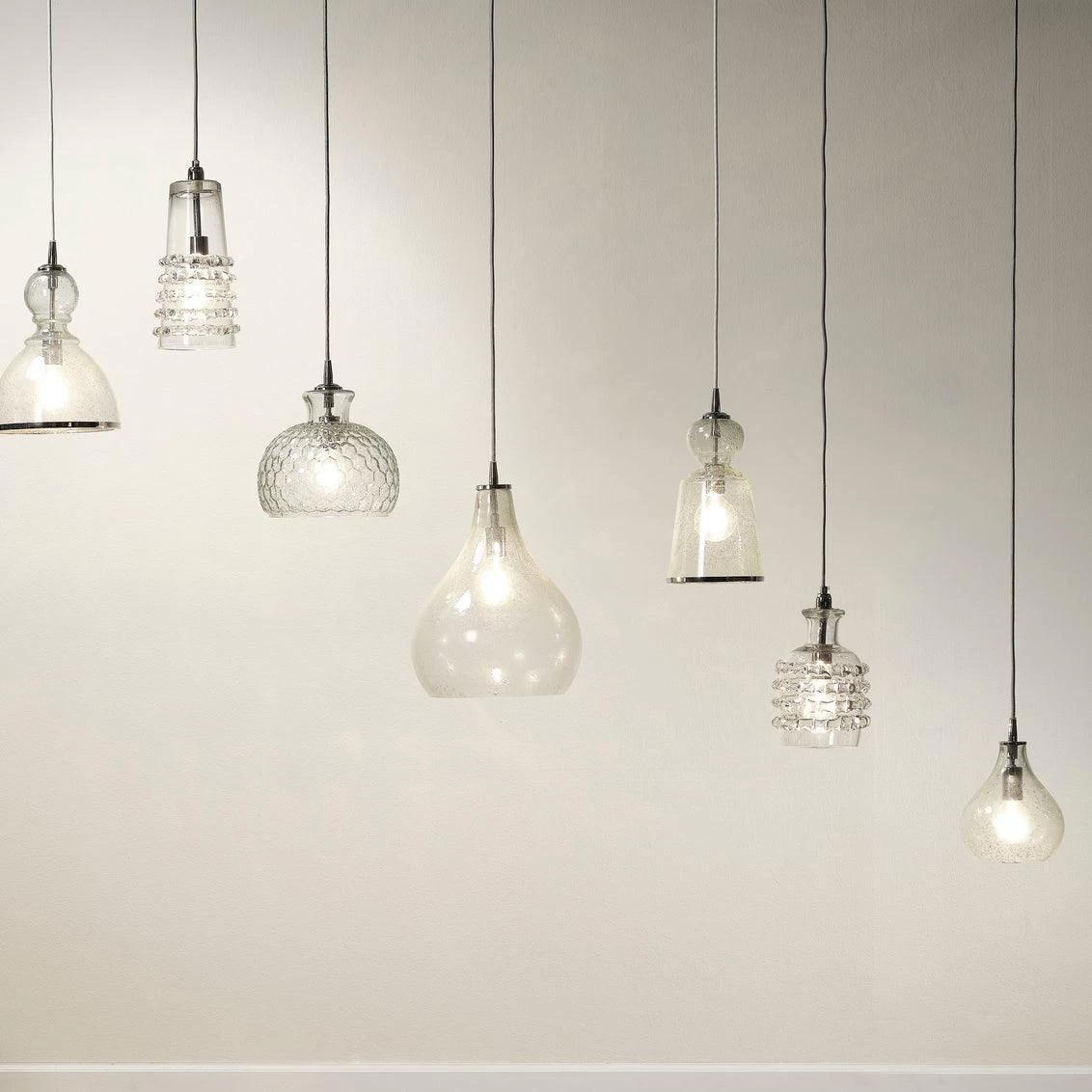 Our Ribbon Pendant Collection is hand-blown with beautiful ribbons of thick glass. These come in two shapes and are available in three colors: all perfect for dinning rooms, bars and kitchens and powder rooms.