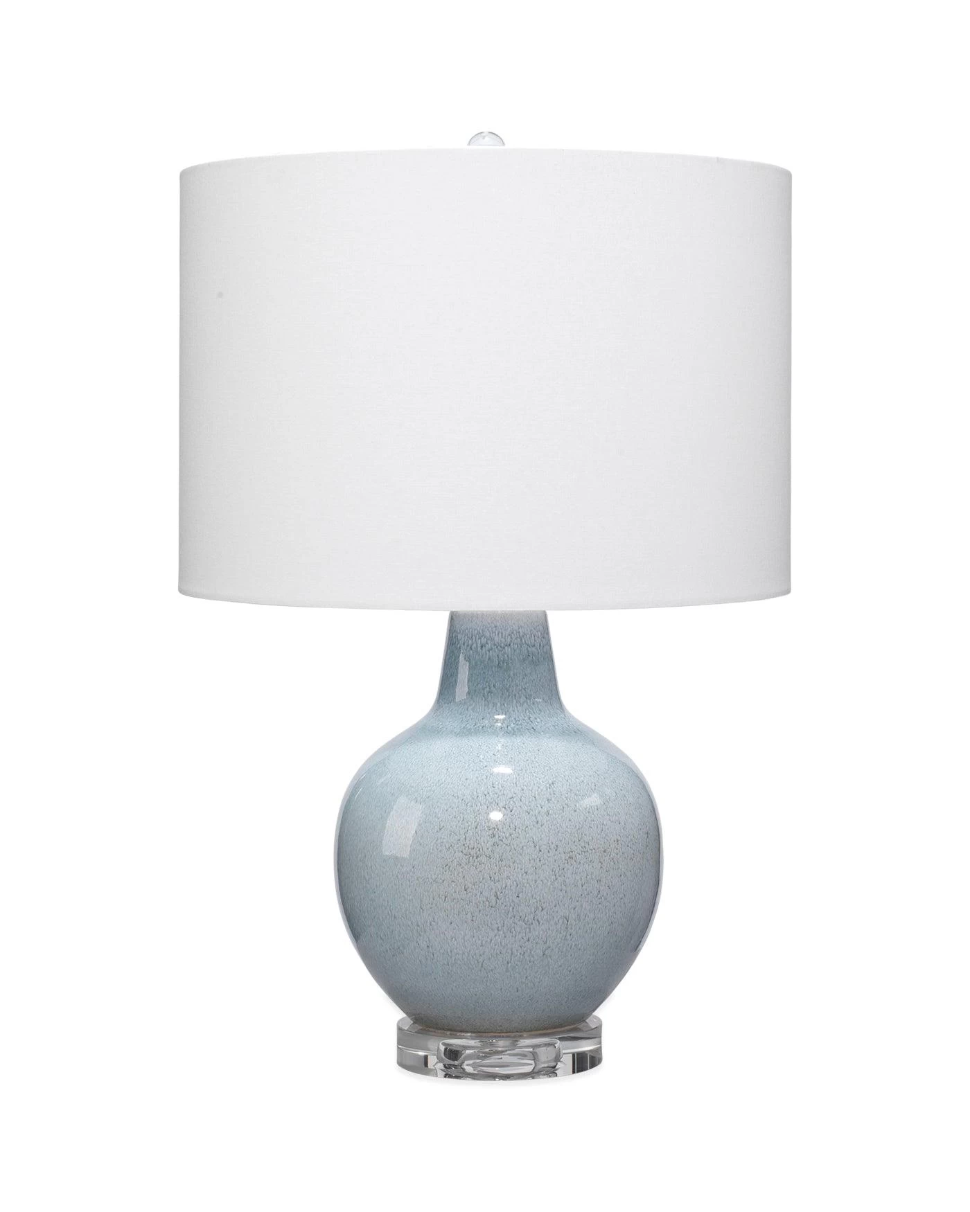 The Audreys classic curvy ceramic base is coated in blue reactive glaze, a technique that ensures each lamp its own unique beauty. A clear acrylic base adds an extra splash of style, and a simple white cotton shade and silver finial keep the look clean.