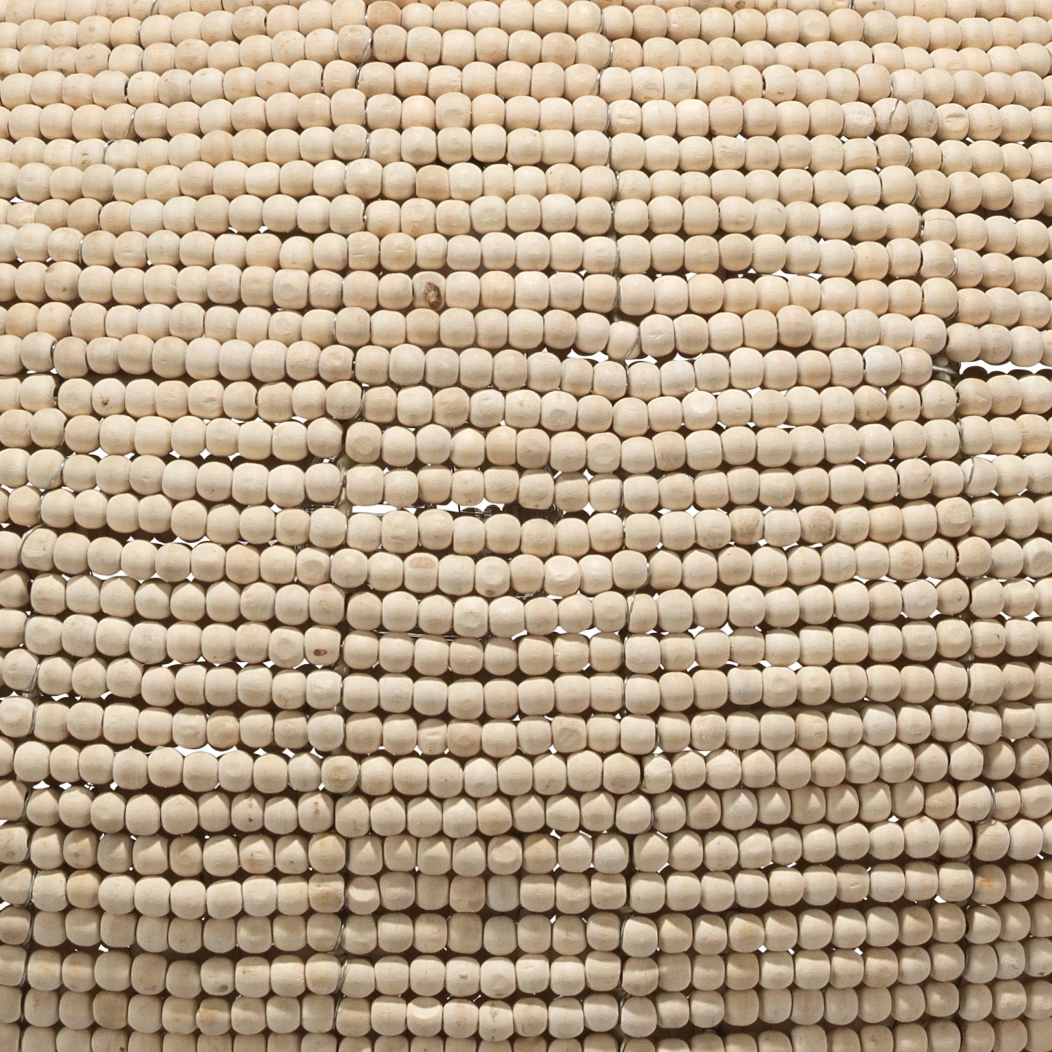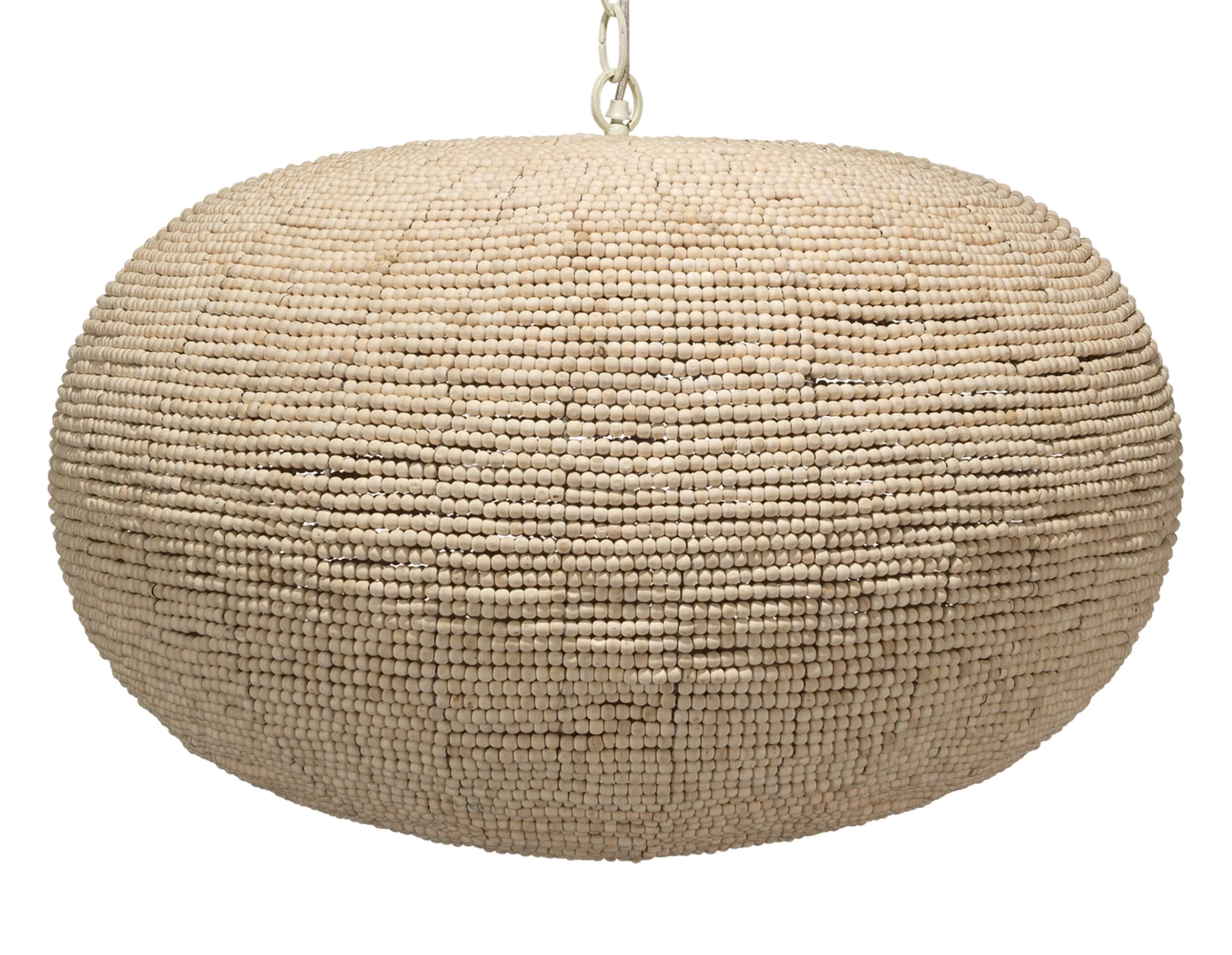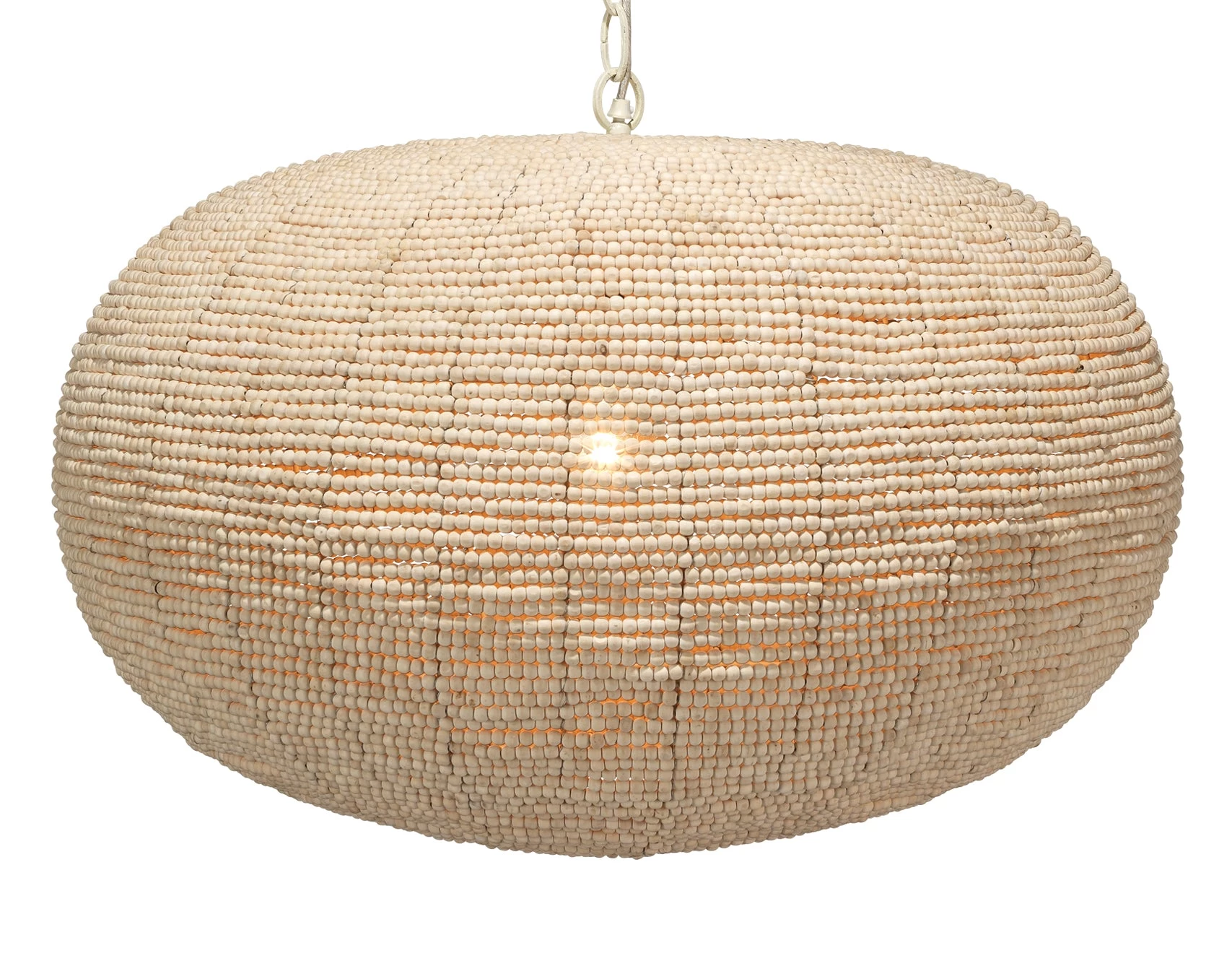 Strings of beads made with mango wood line the body of the oversized Whirlpool Pendant. A white iron chain compliments the Natural tone and texture of this piece. A statement piece with repeating patterns and textures like this can help add interest to any Coastal palette.