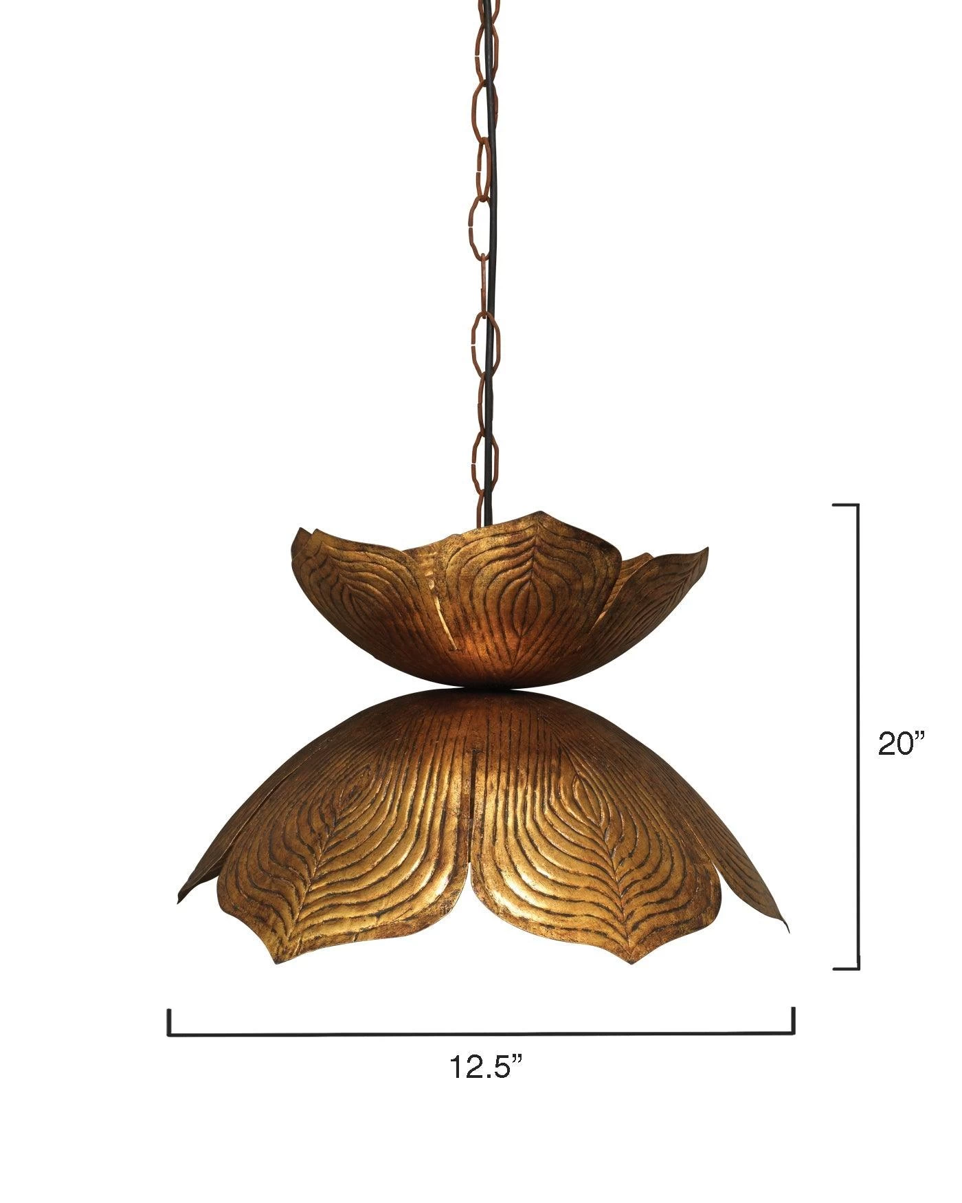 Shimmering and grand, this pendant light features a blooming lotus design that creates a stunning statement. Made of metal and finished in a rich, antique gold that gleams when illuminated.