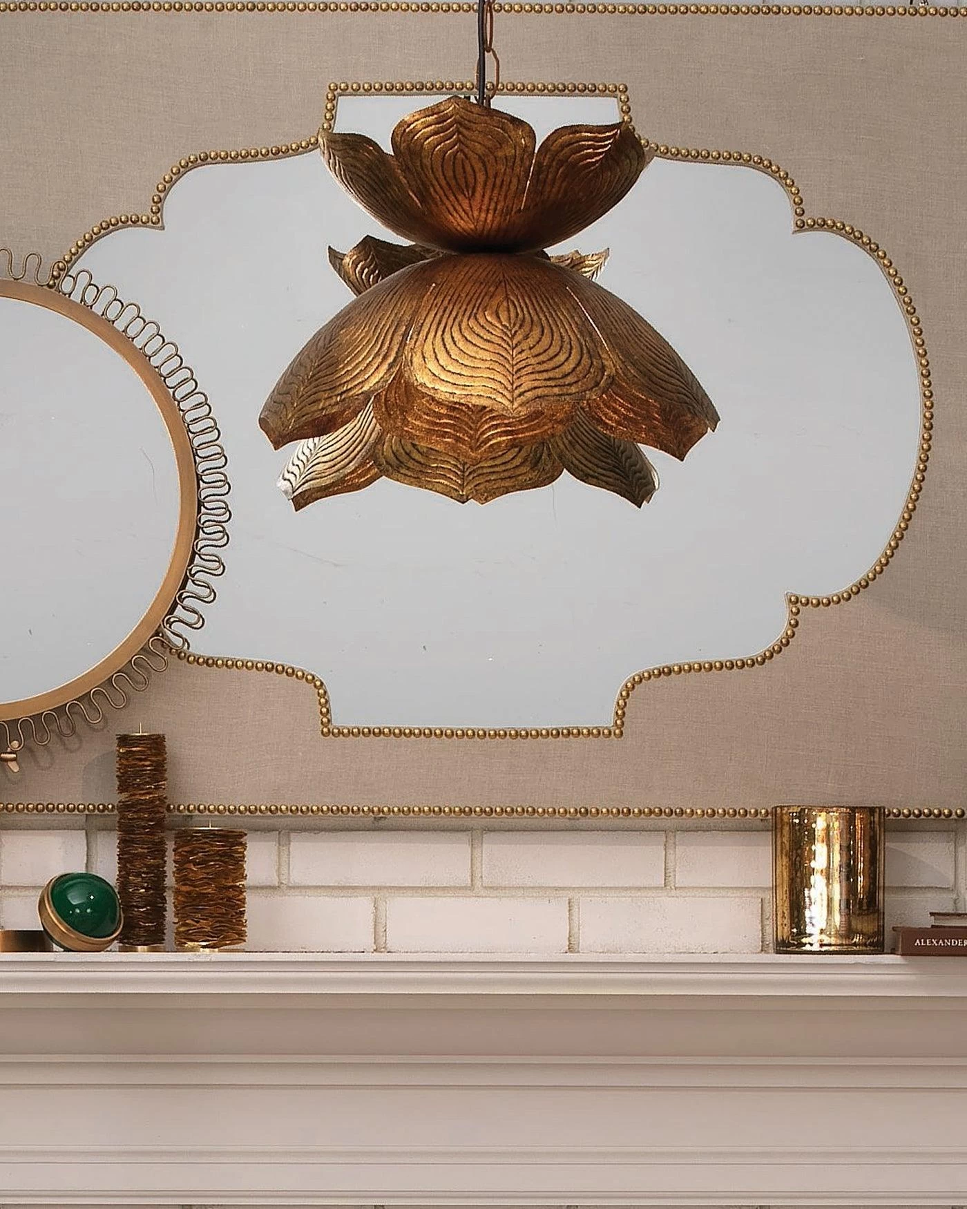 Shimmering and grand, this pendant light features a blooming lotus design that creates a stunning statement. Made of metal and finished in a rich, antique gold that gleams when illuminated.
