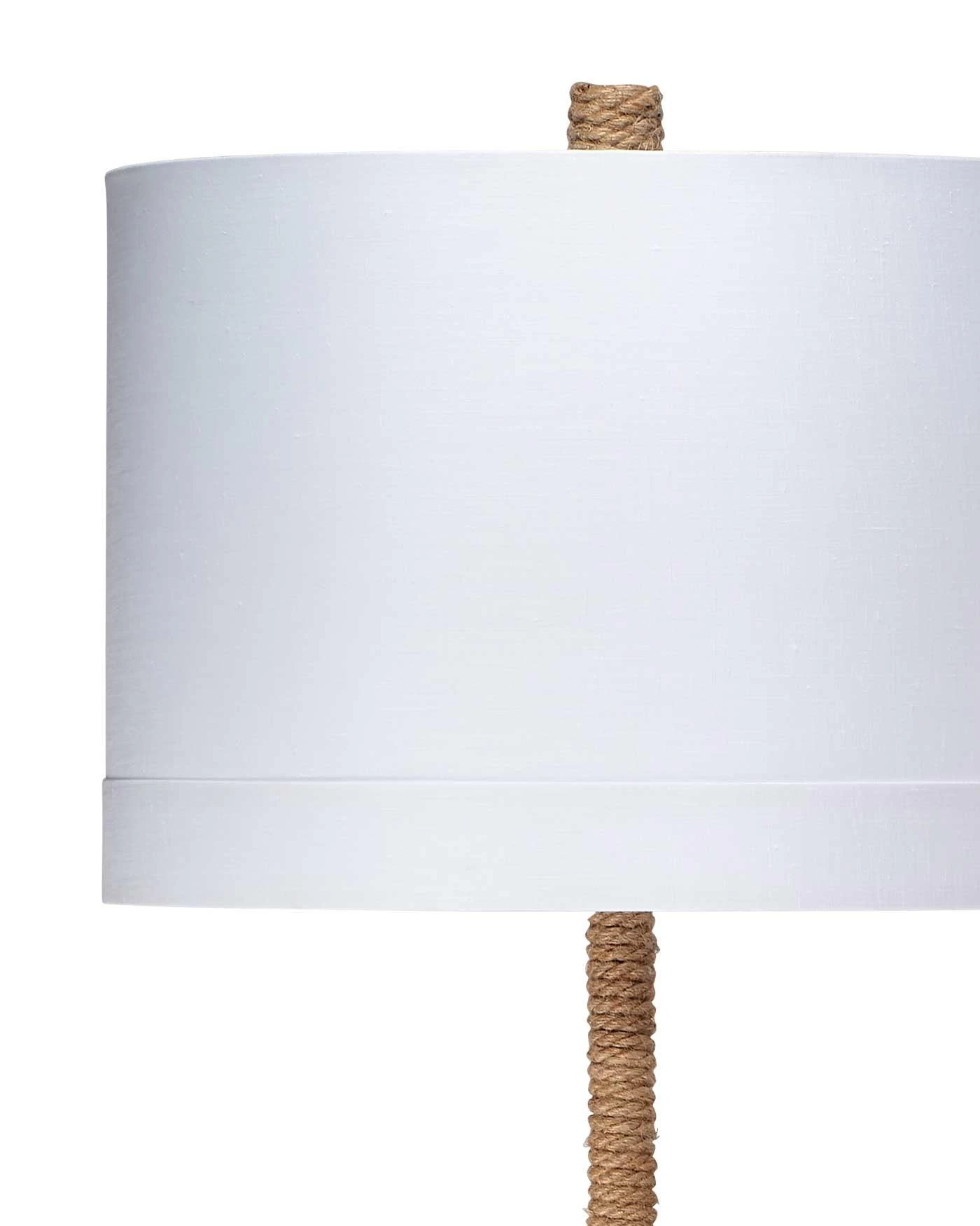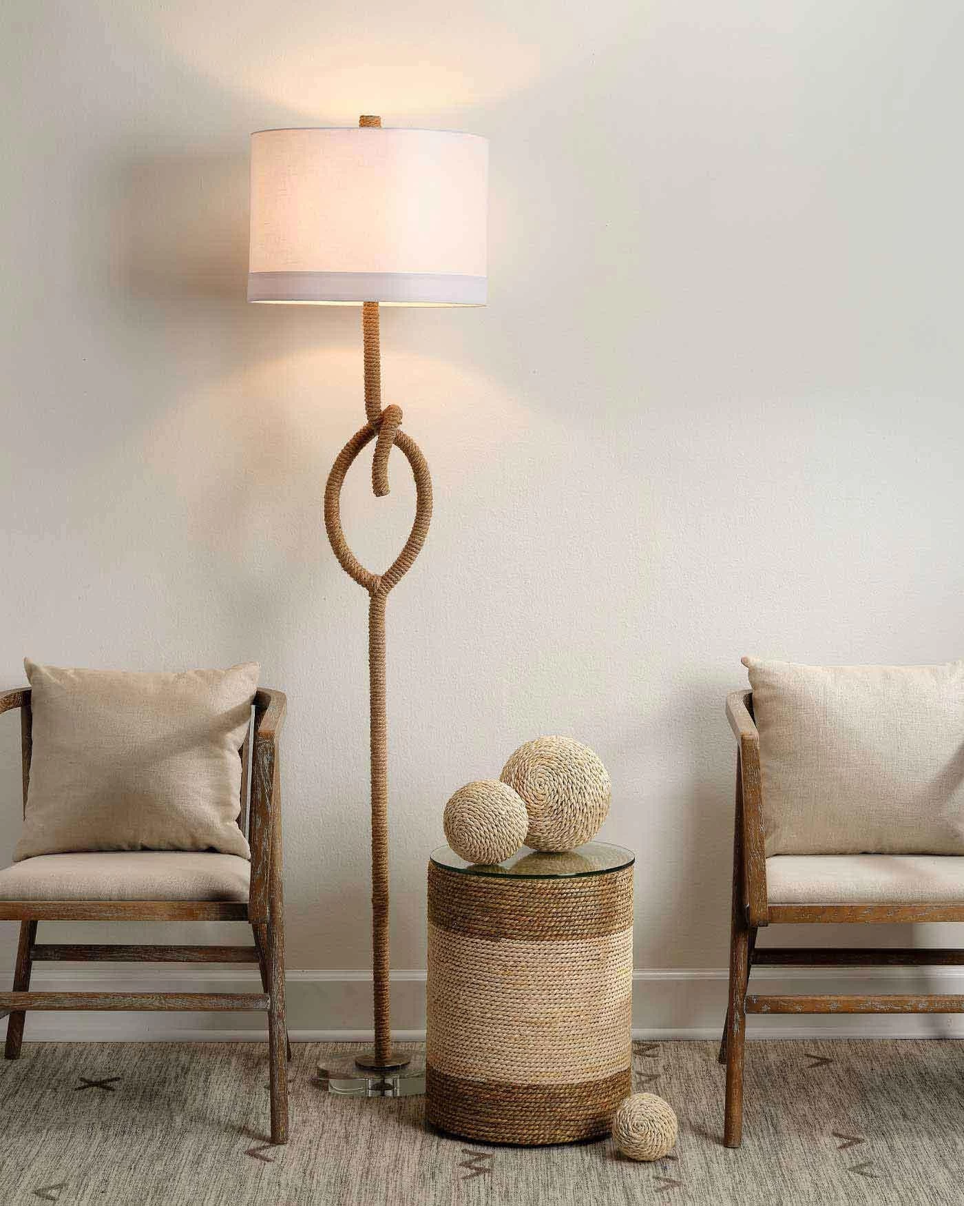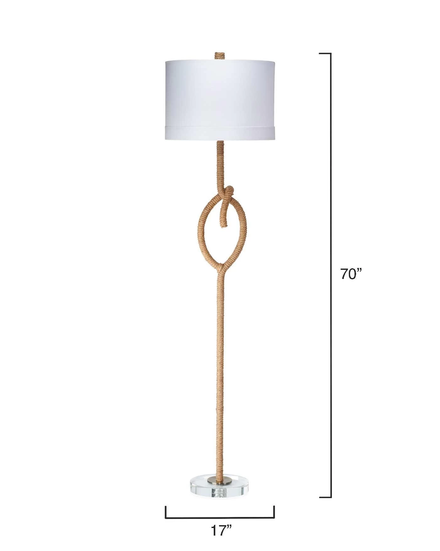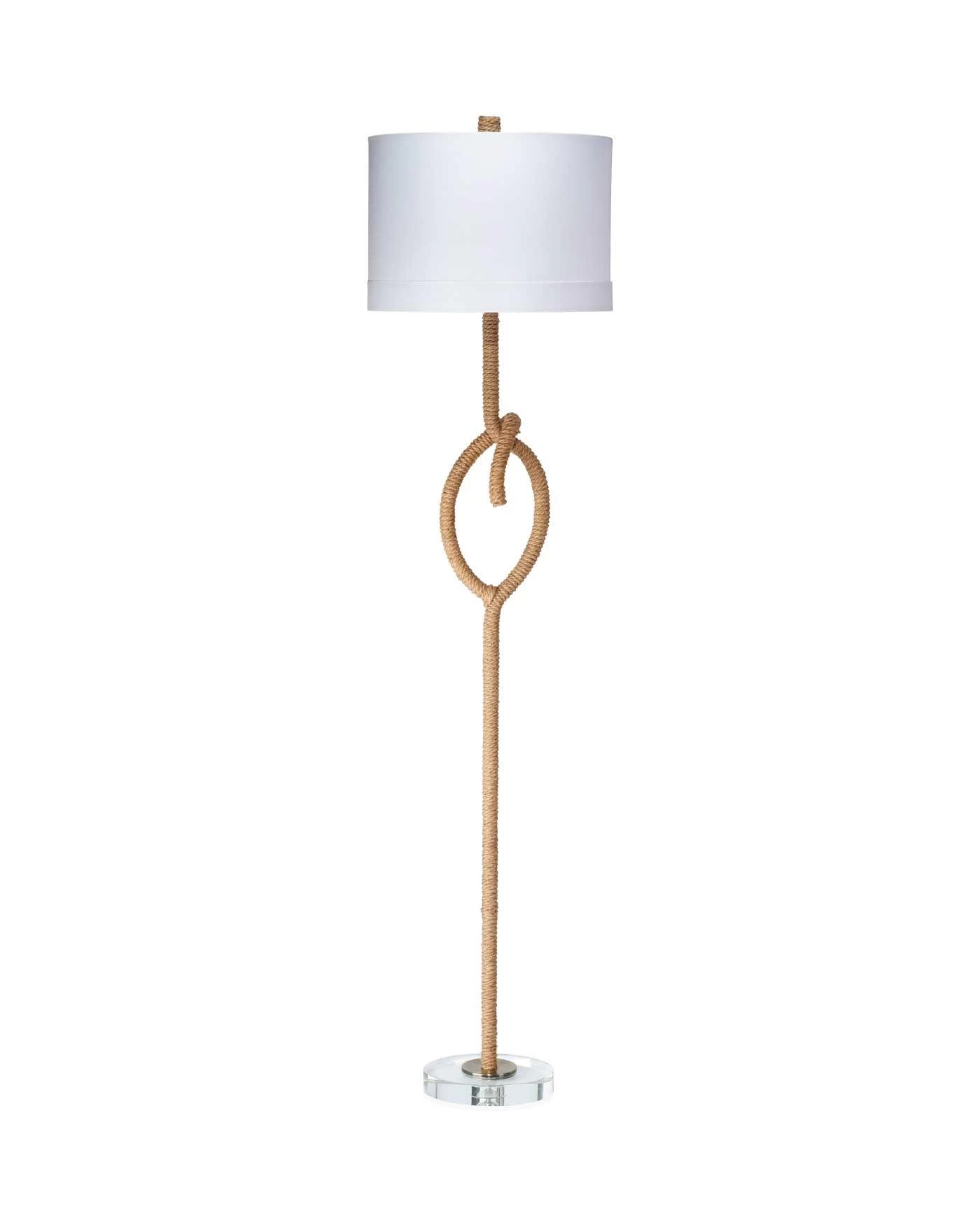 This nautically inspired floor lamp begins as a simple structure with a clear acrylic base but is given bold texture with the addition of Natural rope wrapped around its entire body. The single knot detail brings unexpected personality, and the lamp is topped with a banded white linen shade. The matching rope finial is the cherry on top of this uniquely sculptural floor lamp.