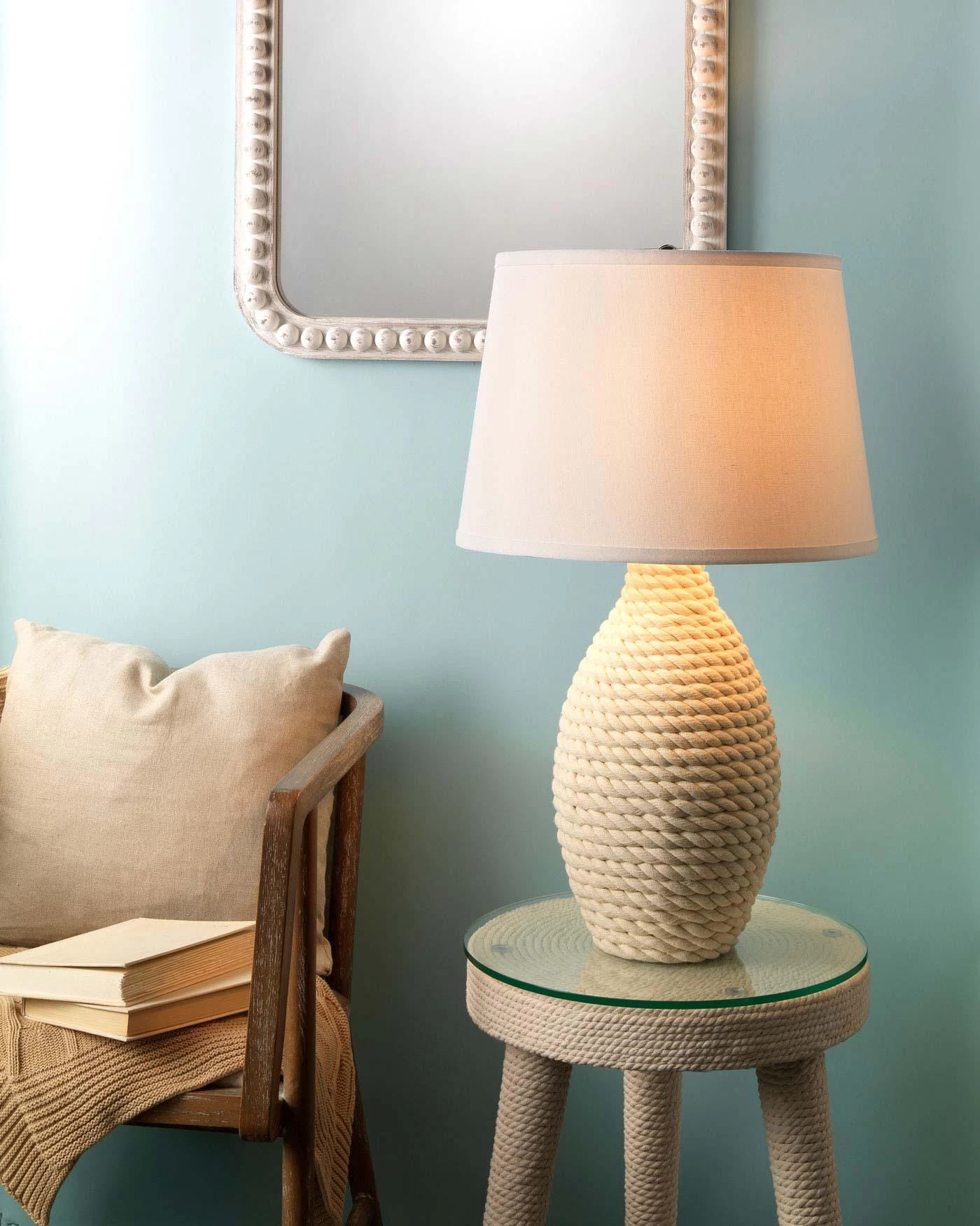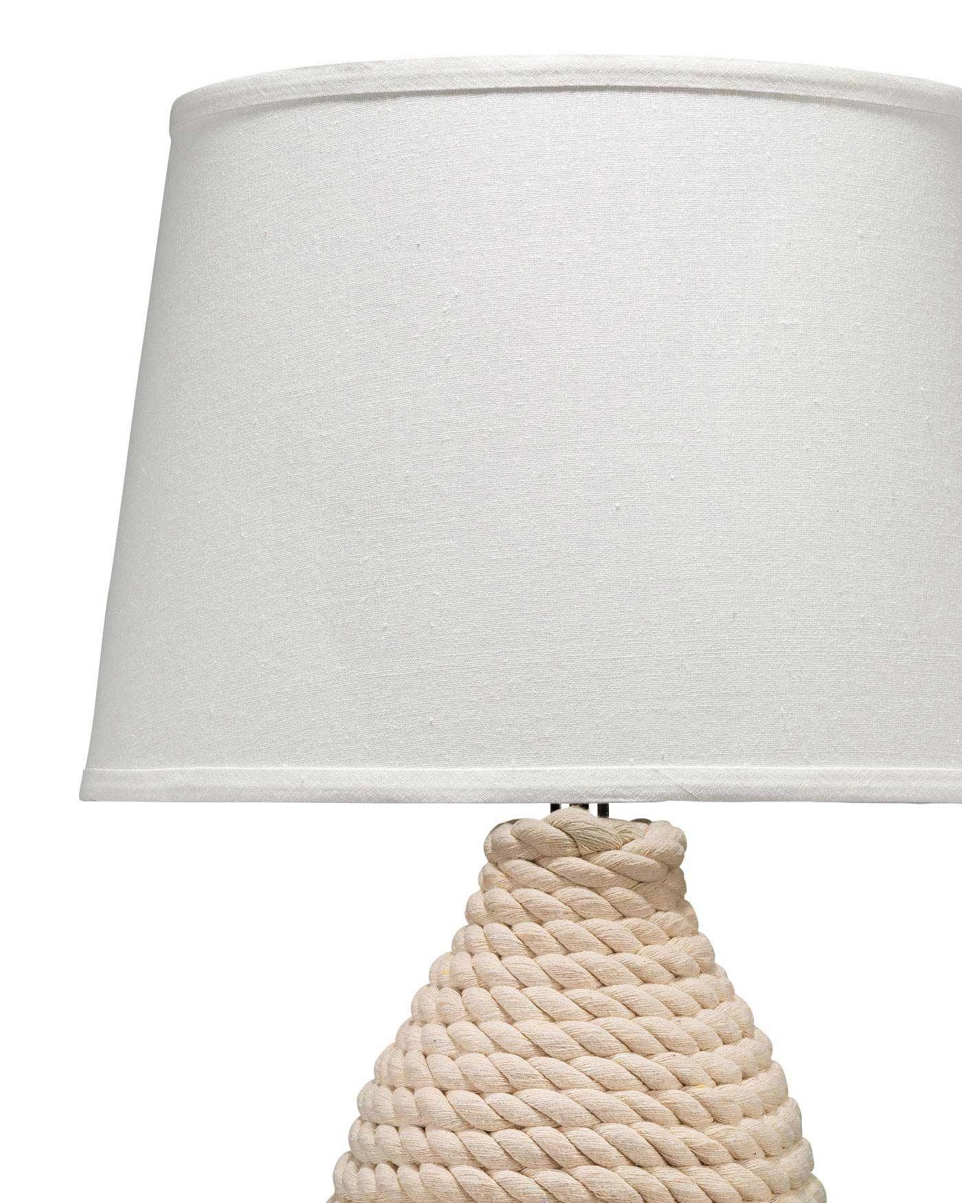 Casual and Coastal, this table lamp is made of white rope bringing the seashore inside. Finial and harp included. Lamp and lamp shade included.