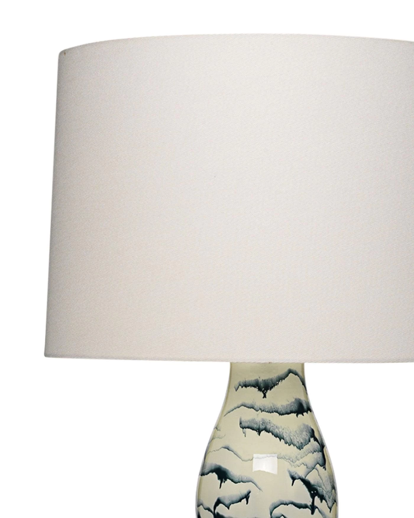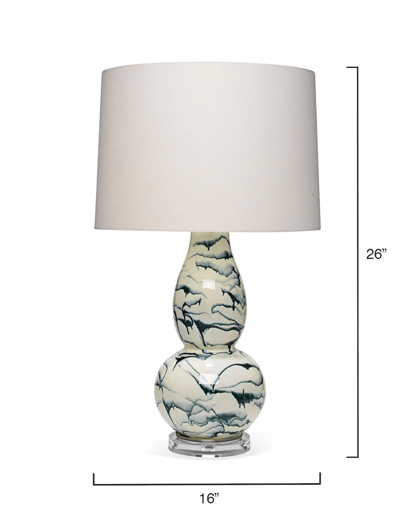 the Elodie double gourd table lamp has an artisan glaze in floating blue swirls on a creamy white body and silver base.