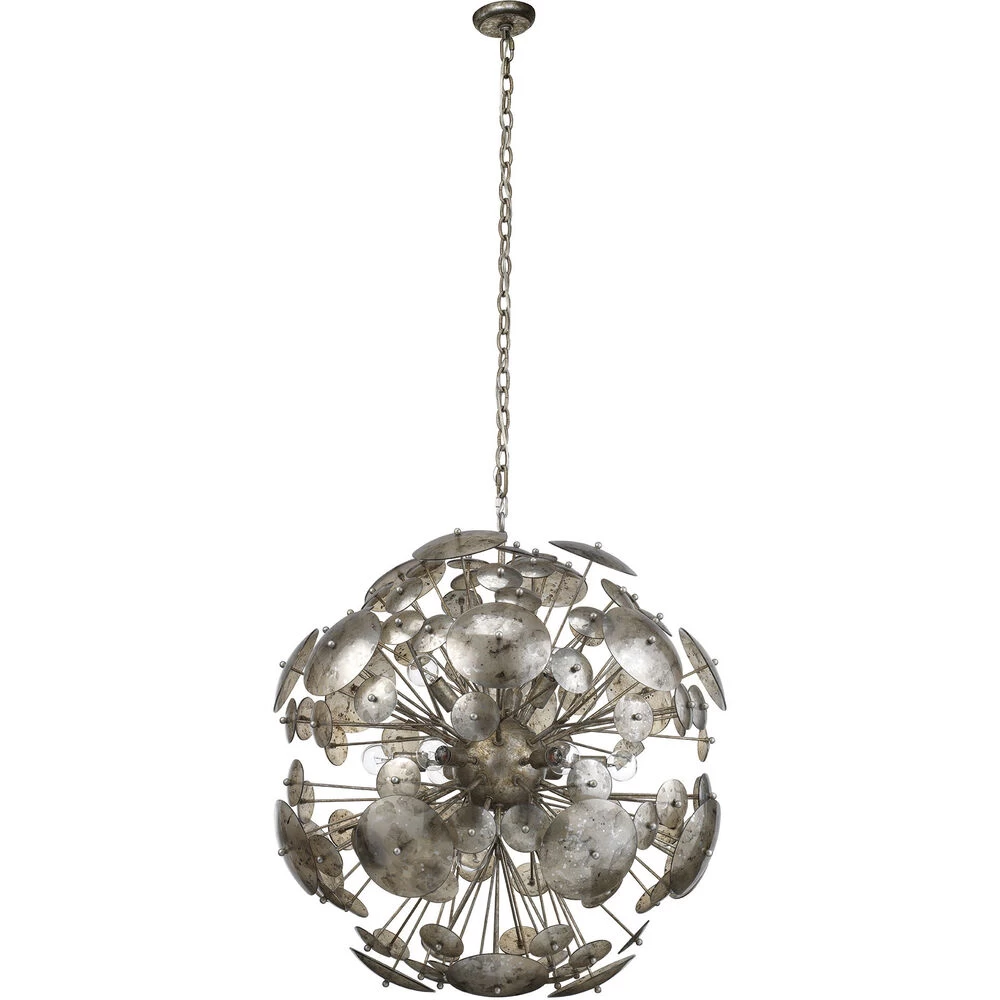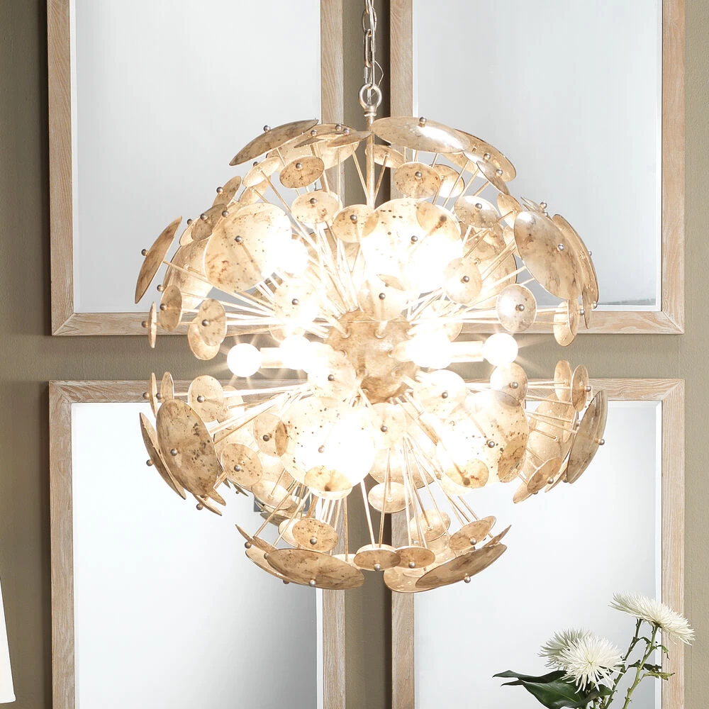 The Constellation Round Chandelier makes a bold modern statement with antiqued glass and champagne leaf metal. Inspired by the mid-century Sputnik chandelier, this hanging fixture provides beautiful ambient light glittering through layers of glass with speckled metallic patterns.