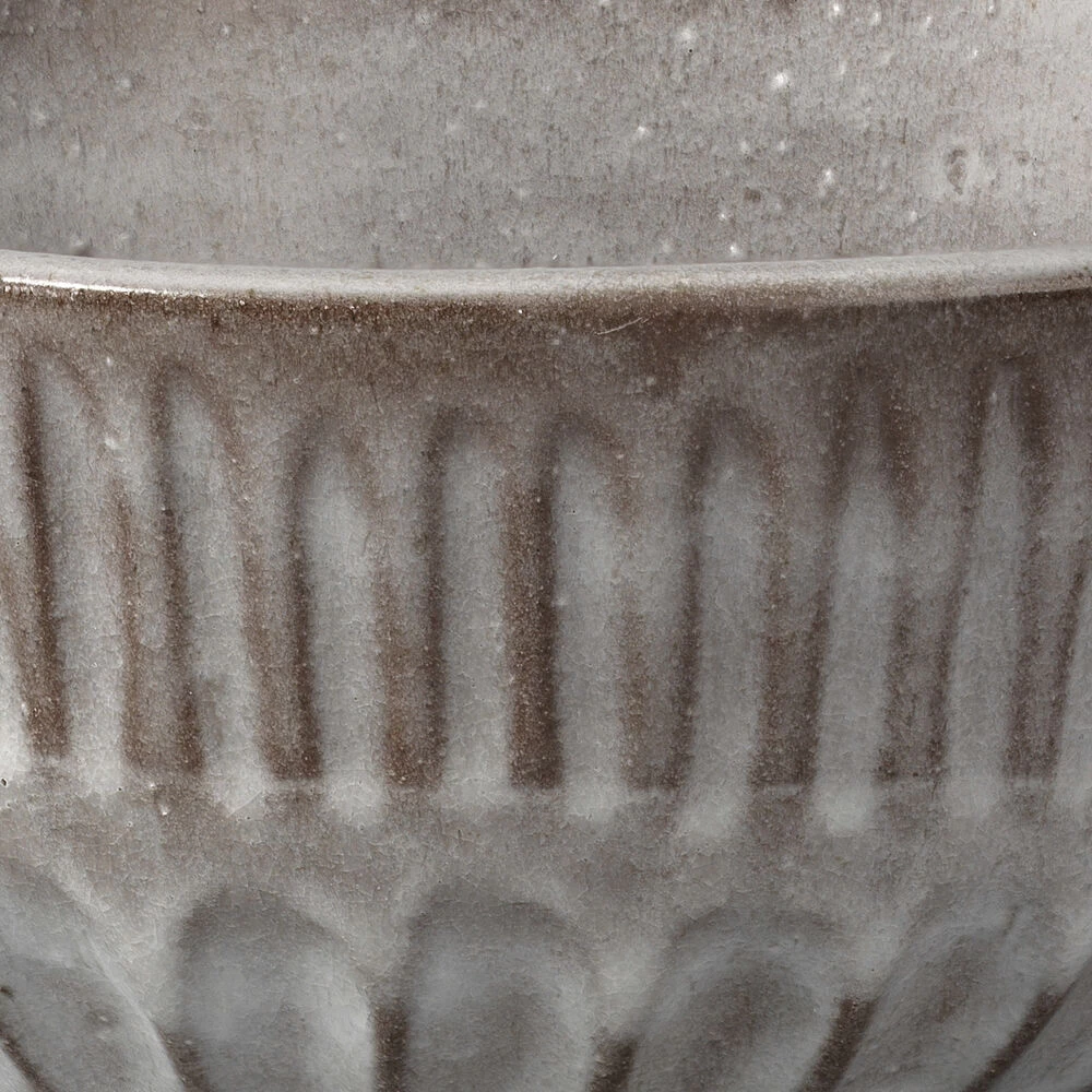 The ash tones and soft textured patterned banding of this handmade bowl make this piece exceptionally adaptable and attractive.