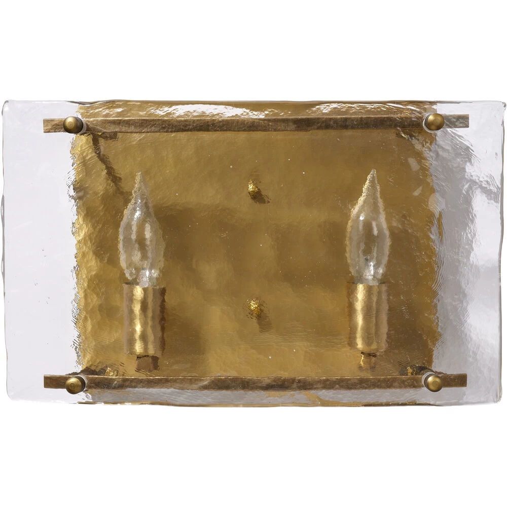A refined study in contrasts, this striking sconce features a softly curved slice of icelike glass that softens and diffuses the “flame” of the bulbs behind it. A softly burnished antiqued brass backplate and arms perfectly complement the richly textured glass. Sophisticated yet simple, this is a beautiful choice for a modern interior.