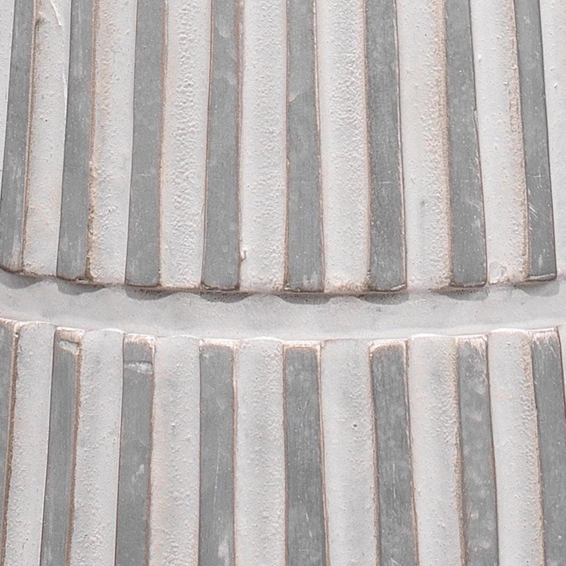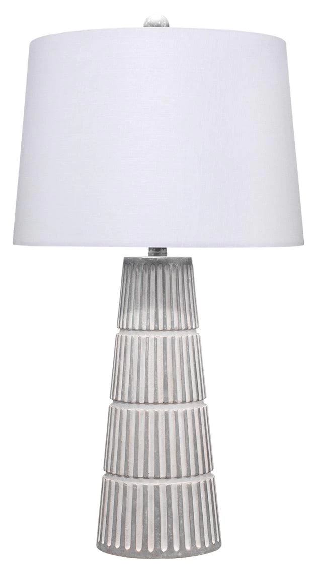 Expertly contrasting rough and refined, the Partition lamp 16-inch-tall conical base is artisan crafted of grey cement. Four rows of horizontal lines are carved into the industrial material, softening its simplicity. A white cone shade in linen and a coordinating resin ball finial are included.