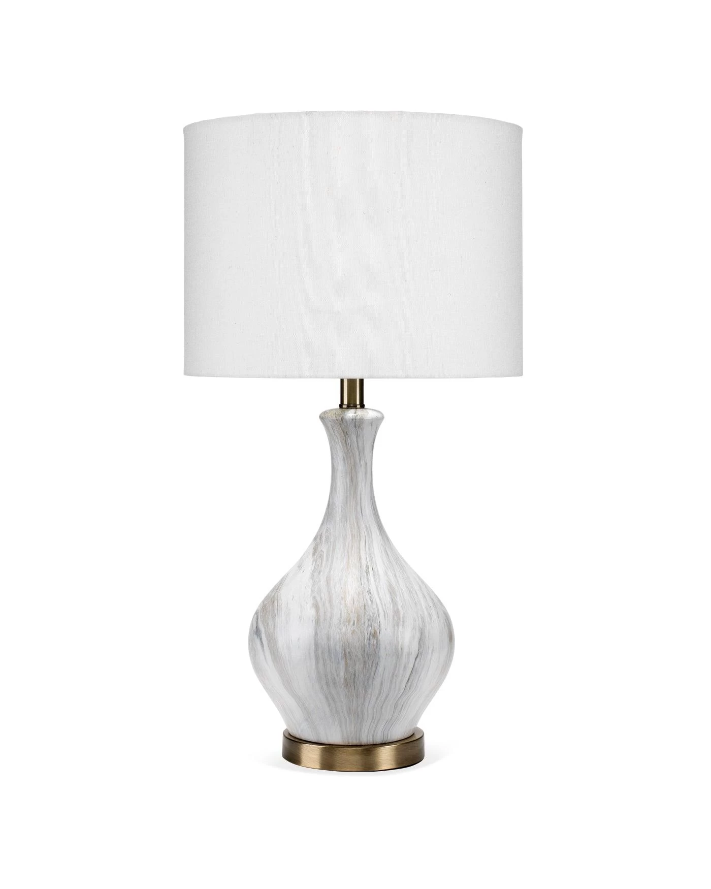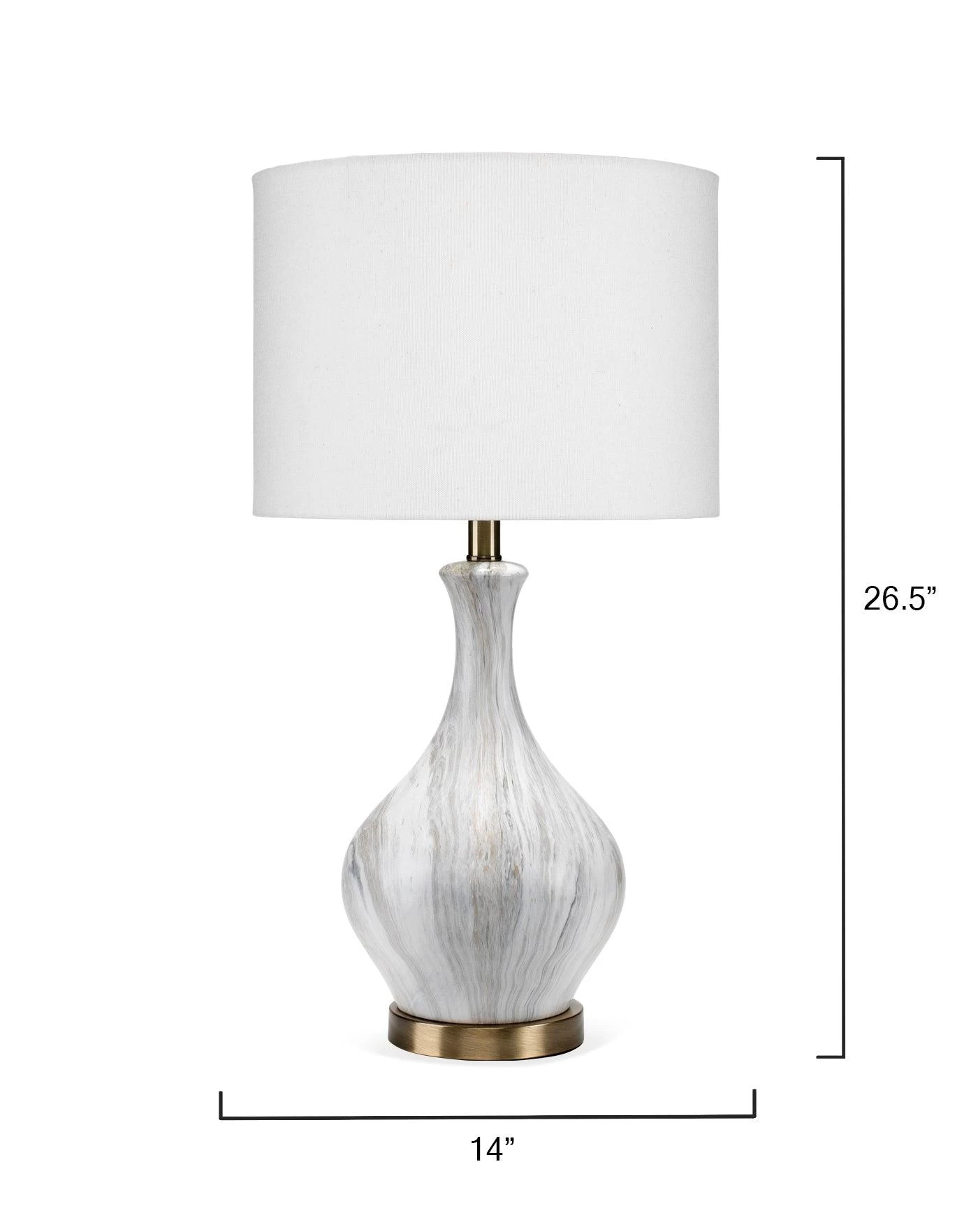 This classic single gourd table lamp with a hand applied faux marble white and grey glaze on a ceramic base with antique brass accents is Modern and Traditional.
