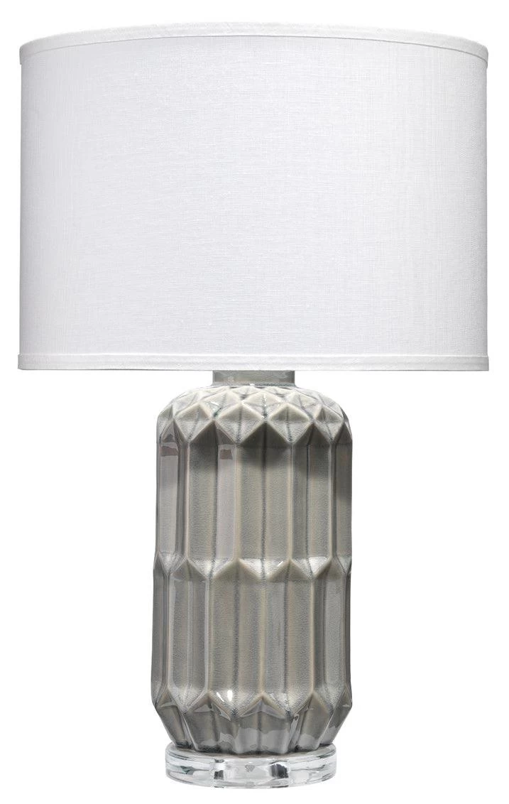 Distinguished by a uniquely facetted ceramic base, the Jewel lamp is finished in shades of grey that accentuate its exhilarating patterns. This tabletop treasure is topped with a classic drum shade in white linen, which is itself topped with an acrylic ball finial with a metal base.