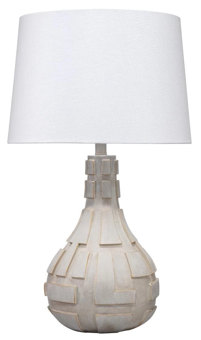 Influenced by remembered images including Mayan ruins and Mondrian-inspired architecture, the graphic bas-relief style lines on the base of this table lamp demand attention. The Complex is formed by artisans from high quality grey resin, and is topped with a cone shade in white linen. The piece-de-resistance? A resin finial with coordinating markings.