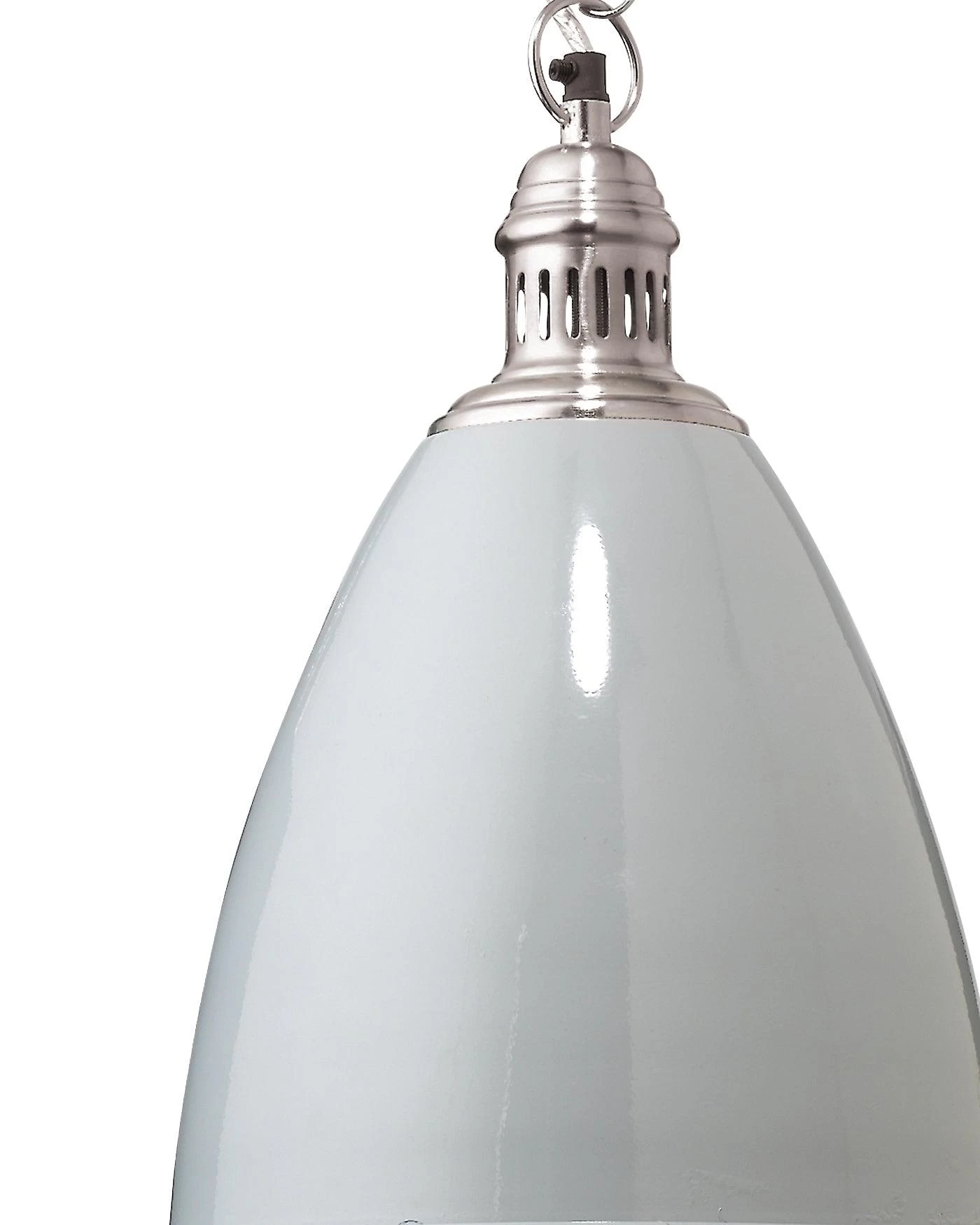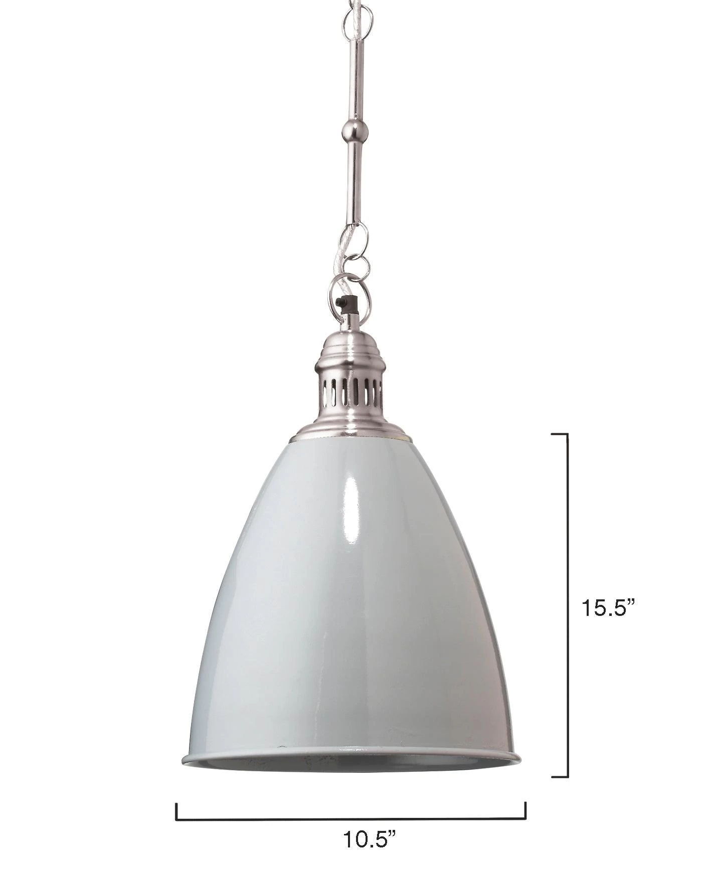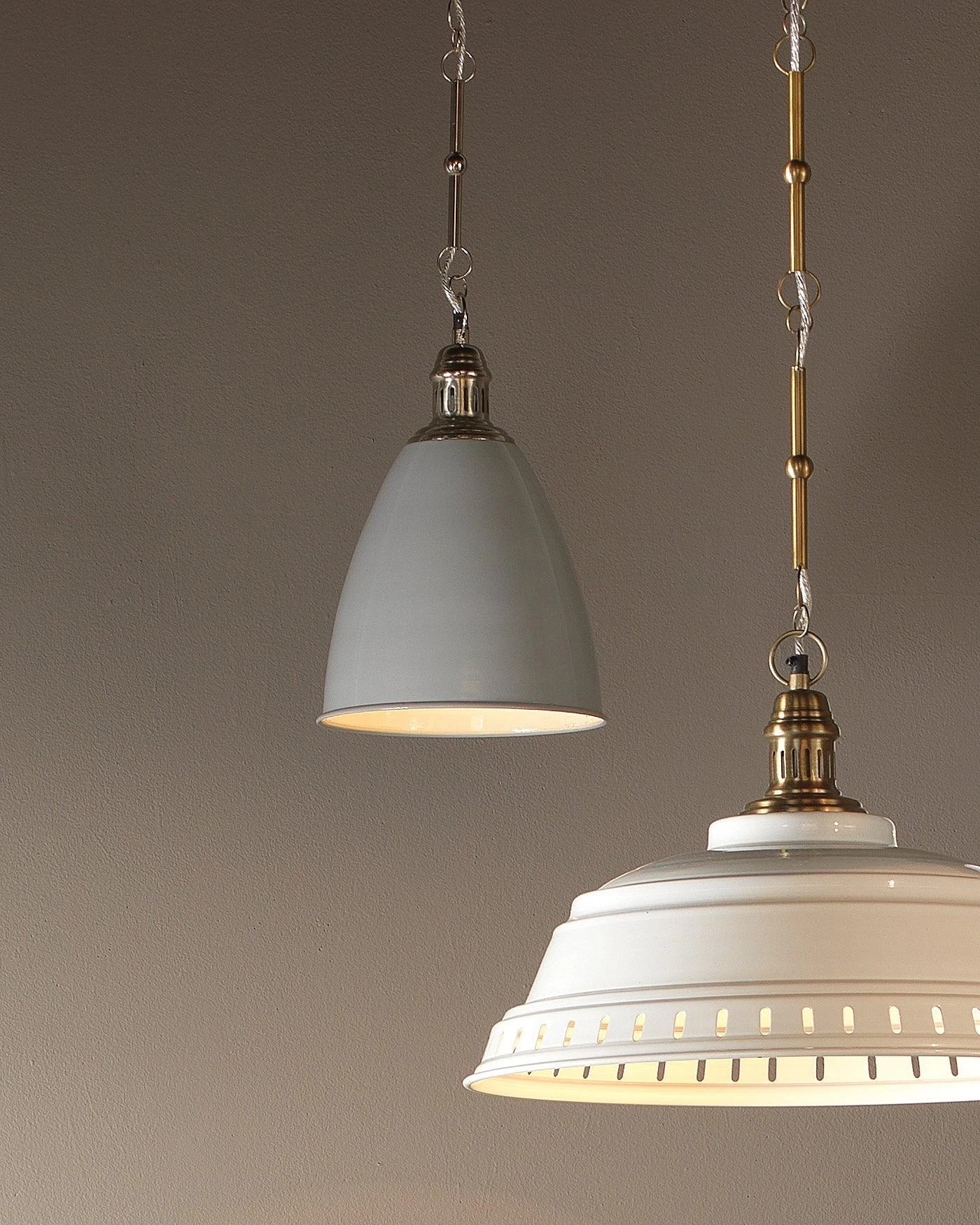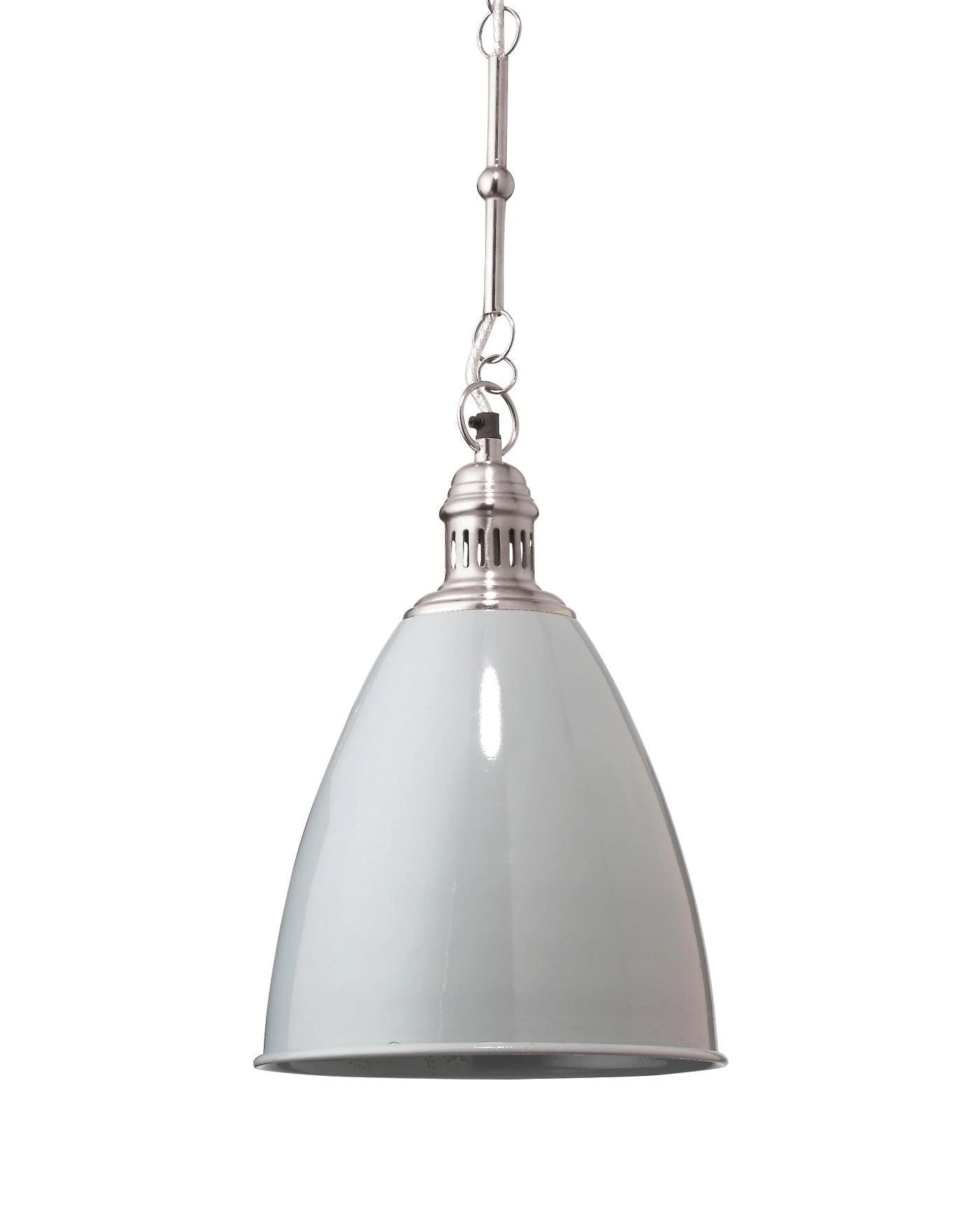 This metal pendant was inspired by the industrial age, yet Modern ized by a sleek white lacquer and a decorative brass chain.