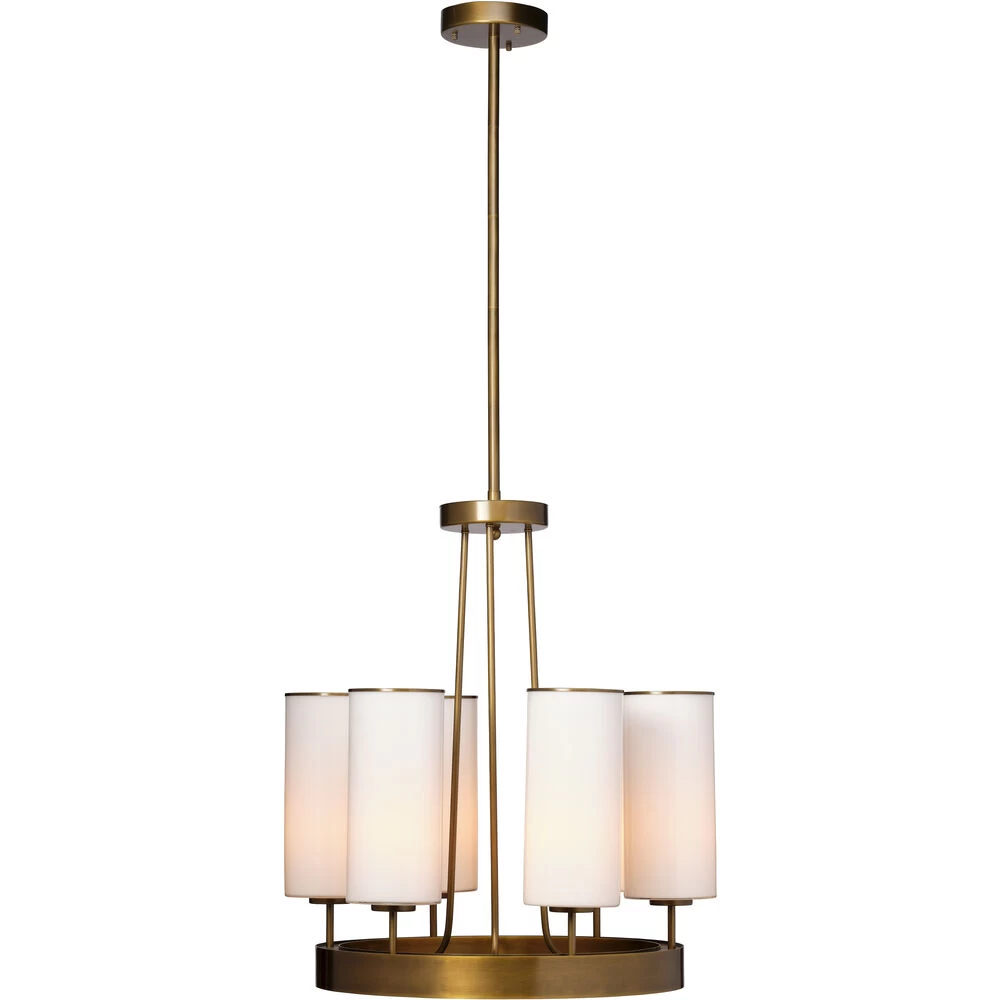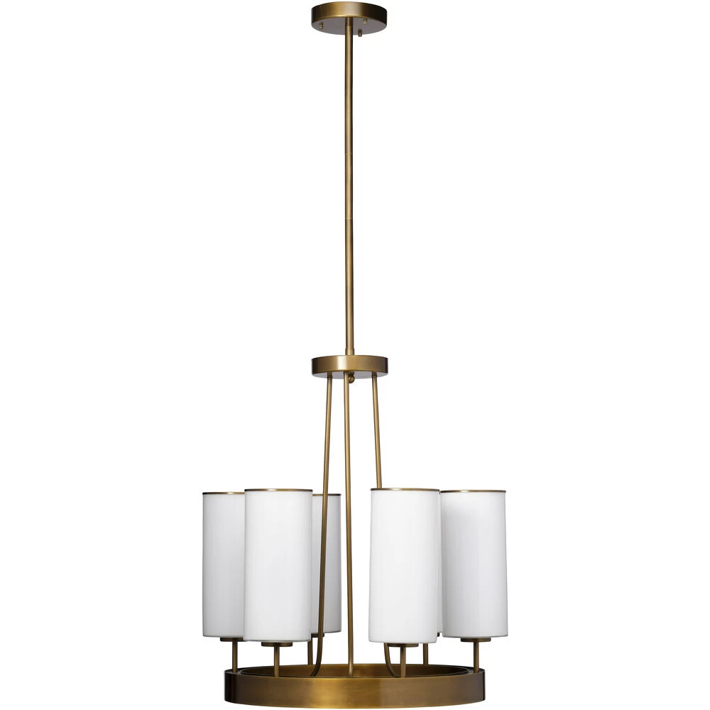 Six opaque white glass cylinders, each artisan handcrafted, float above an antiqued brass base in this sublime chandelier. They create an intensely diffused glow and soft, filtered, flattering light. Try above your dining table to make every meal a little more romantic! The exposed hardware and canopy are all antiqued brass, and professional installation is recommended.
