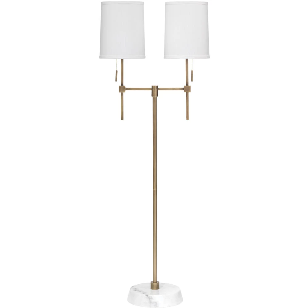 Antique brass metal and white linen shades create a clean look for the Minerva Floor Lamp. The petite height of this dual socketed floor lamp is the perfect pair to any arm chair. Relaxing in your favorite seat is twice as nice with two sockets for ample reading light.