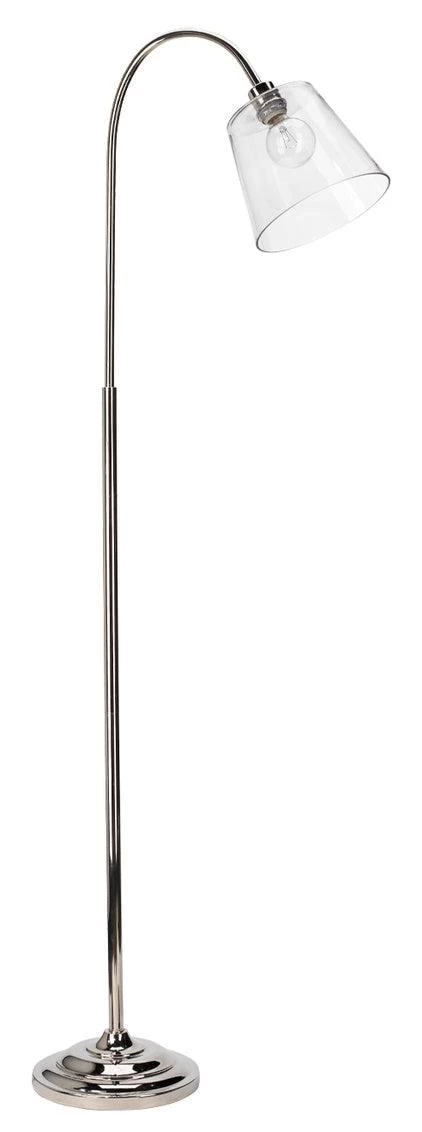 A long, graceful neck and an oversized, clear shade intensify the elegance of this deceptively simple floor lamp. Beautifully crafted of two elemental materials, metal and glass, they are offered in your choice of three rich finishes: nickel, antique brass, or oil-rubbed bronze. As the bulb inside is visible, these are ideal for use with decorative Edison style bulbs.