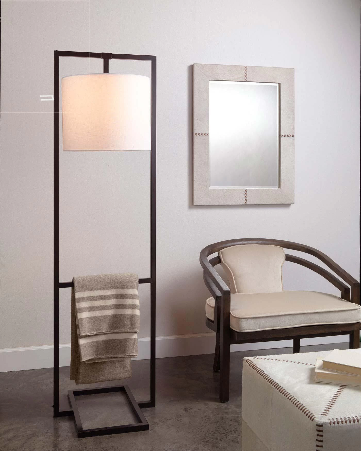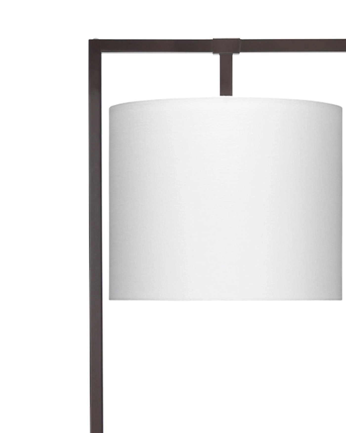 Strong straight metal lines, forged from steel and finished in an oil rubbed bronze, create a dynamic frame for the softly diffused light generated by a large white linen drum shade and acrylic diffuser.