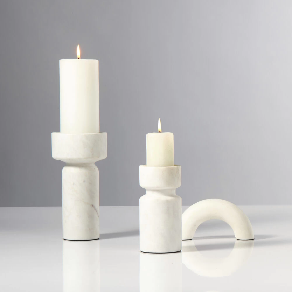 These artisan-crafted marble objects celebrate the beauty of the natural stone from which they are carved. The simplicity of their lines allows the white marble to shine, highlighting and honoring its intrinsic veining, colors, and patterns, and ensuring that no two will be identical. While their original inspiration was London’s Marble Arch, the design didn’t coalesce until Jaime stripped it of its rigid architectural beginnings and added a soft organic quality, resulting in the lovely, graceful piece you see here.