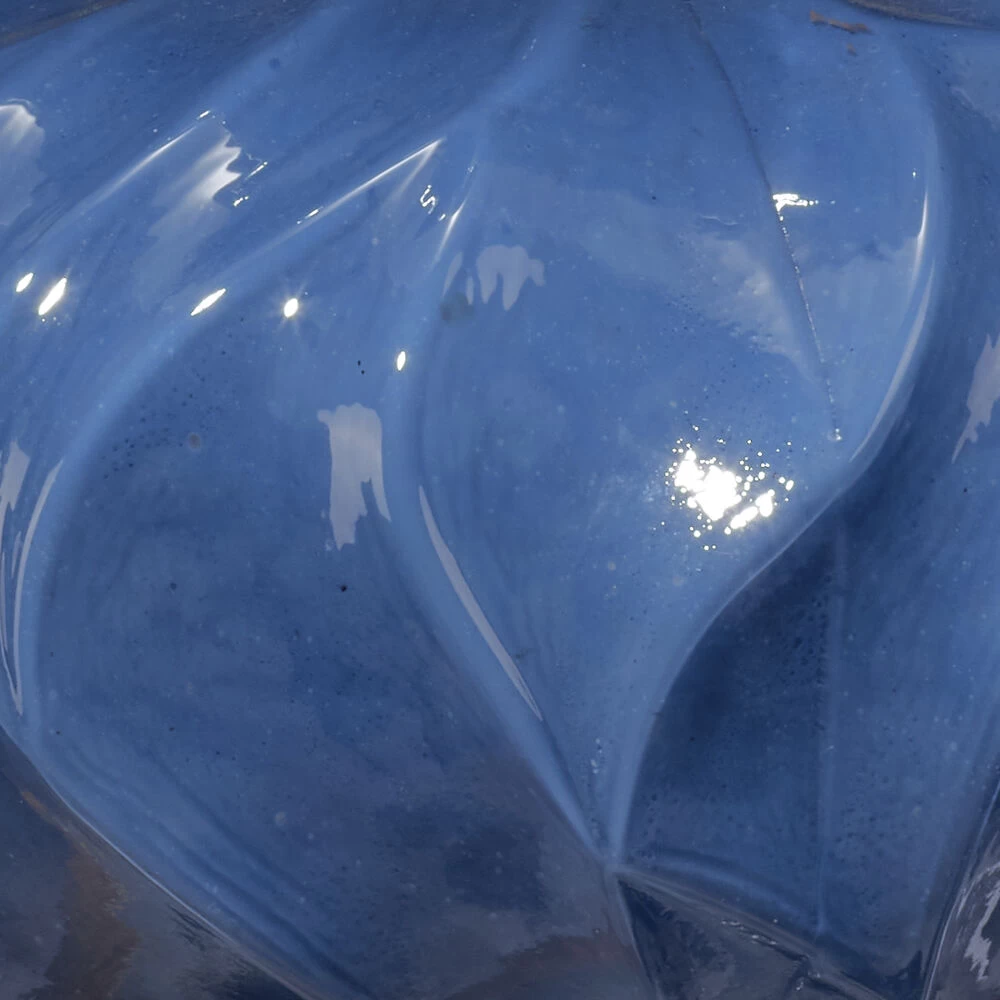 The shapely base of this table lamp has been expertly handmade of glass. Its simple geometric shape is enhanced with richly expressive textural patterns influenced by the rippling of still water. Placed on an acrylic base and balanced with a white linen shade to illuminate memories for years to come. Variations and subtle markings make this lamp a statement piece in any bedroom, living space or home office.