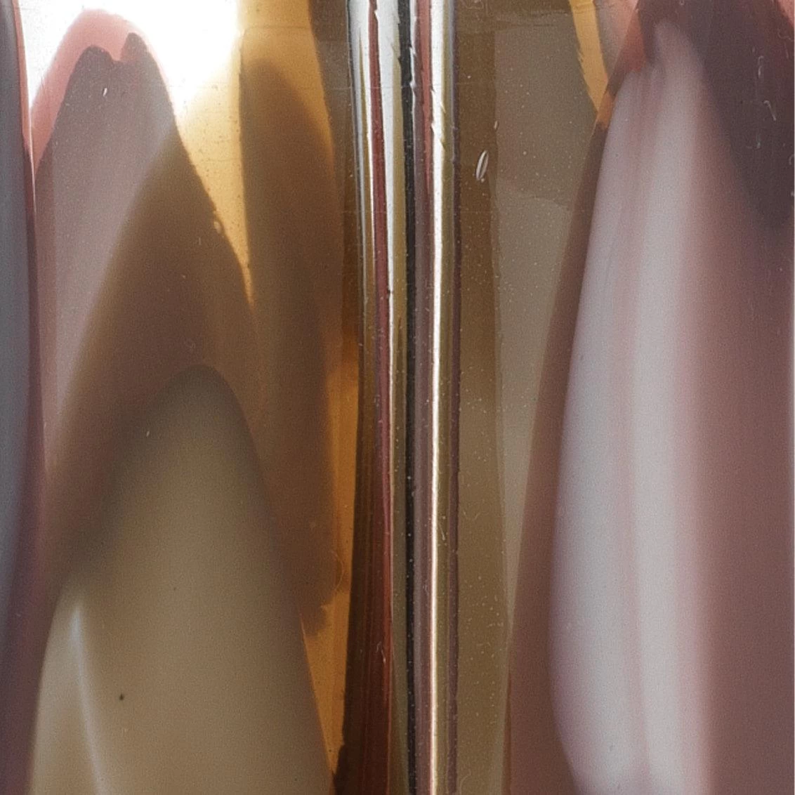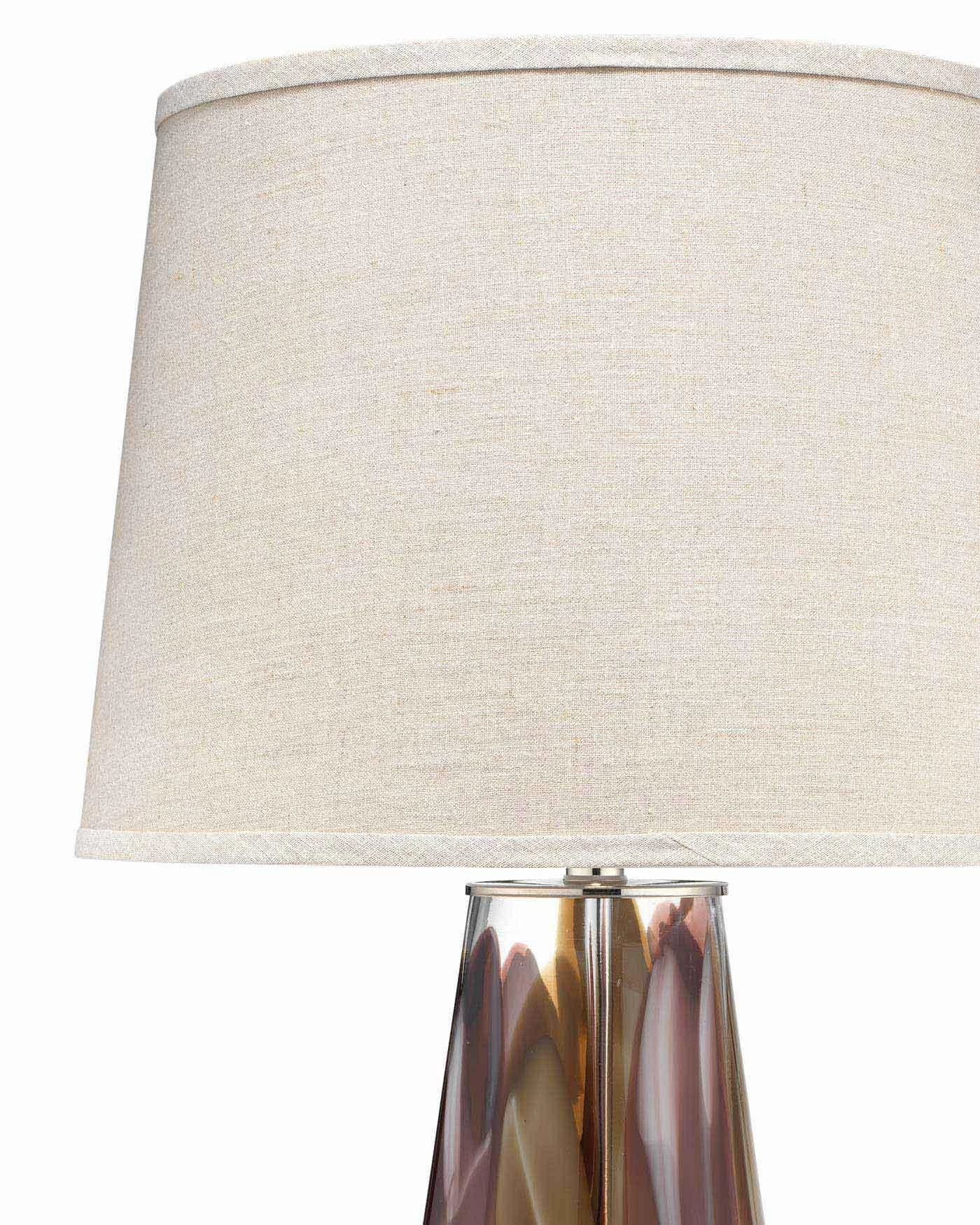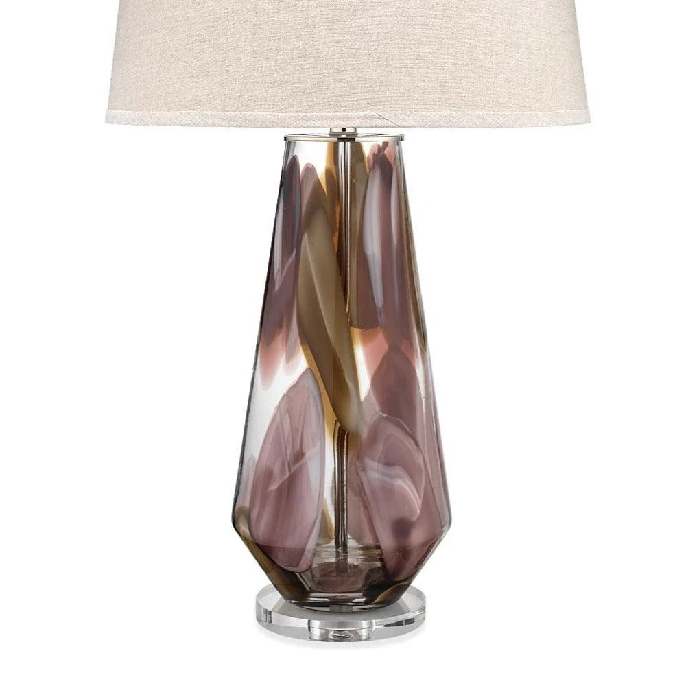 This mouth blown glass lamp was inspired by watercolors of the 70’s with beautiful plums and soft browns. This soft, warm lamp can go with both silver and brass accents in any room.