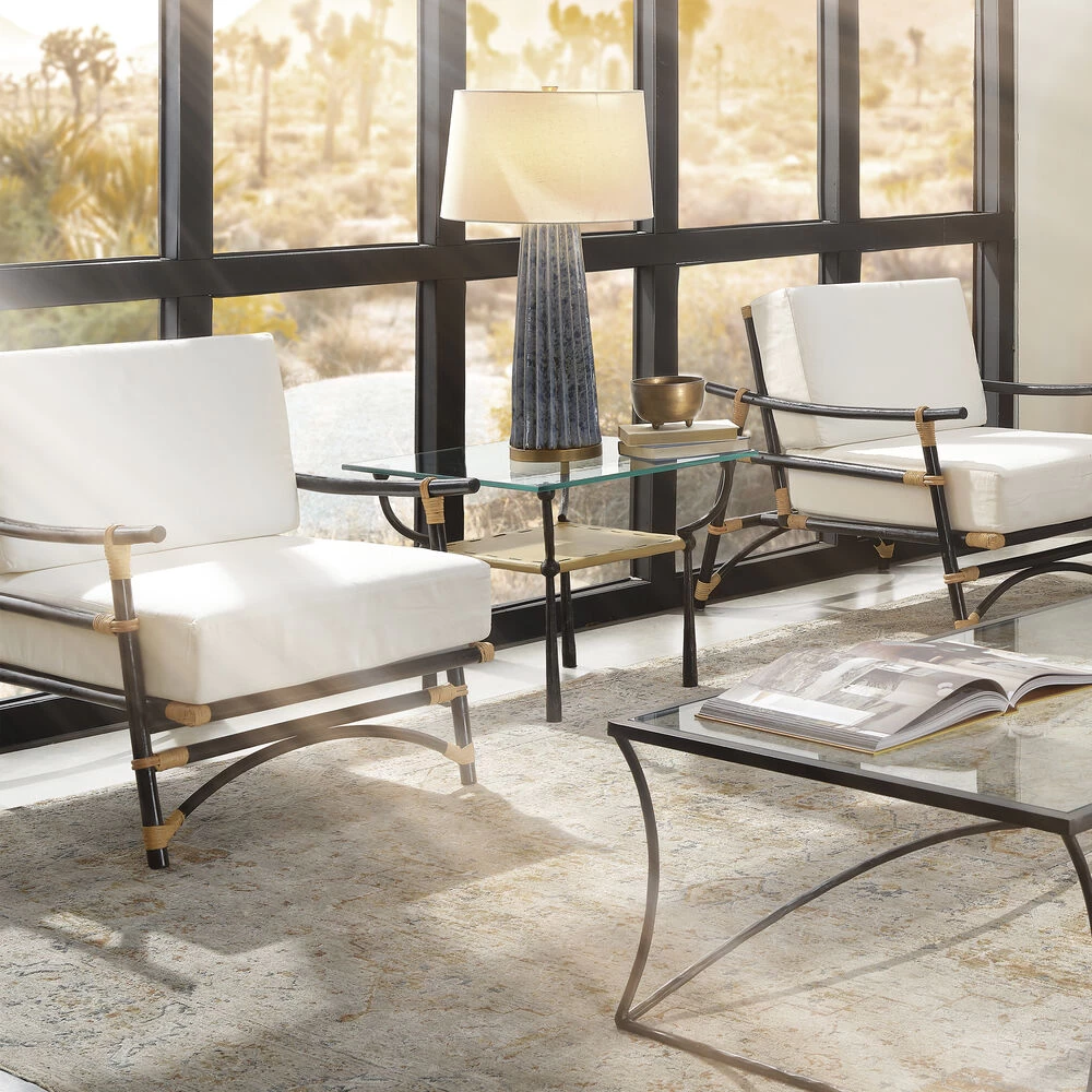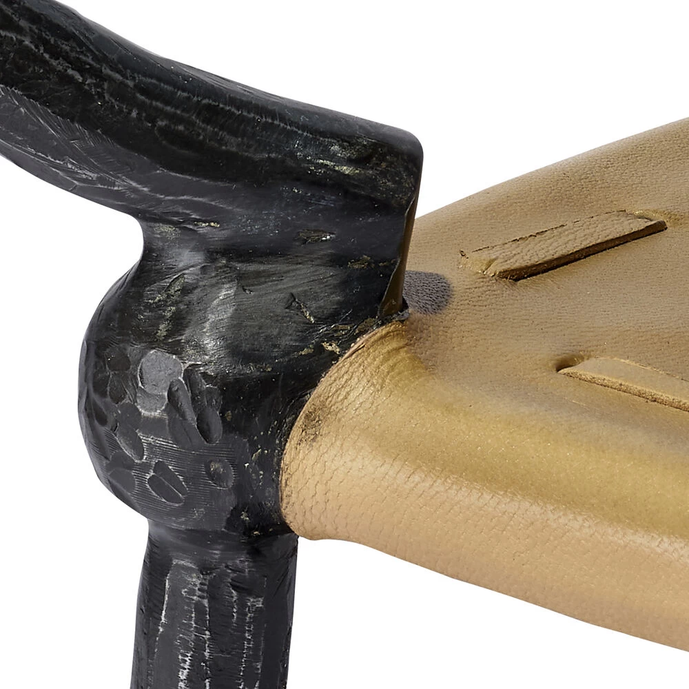 The focal point of this handsome accent table is the layer of rich, buttery camel leather. The softness of the leather contrasts superbly with the roughly hammered iron legs that anchor the piece. The legs rise up and then gently curl around to both cradle the leather and support the thick slab of strong glass that forms the table’s top. Finely crafted, this piece has a timeless look that never goes out of style.