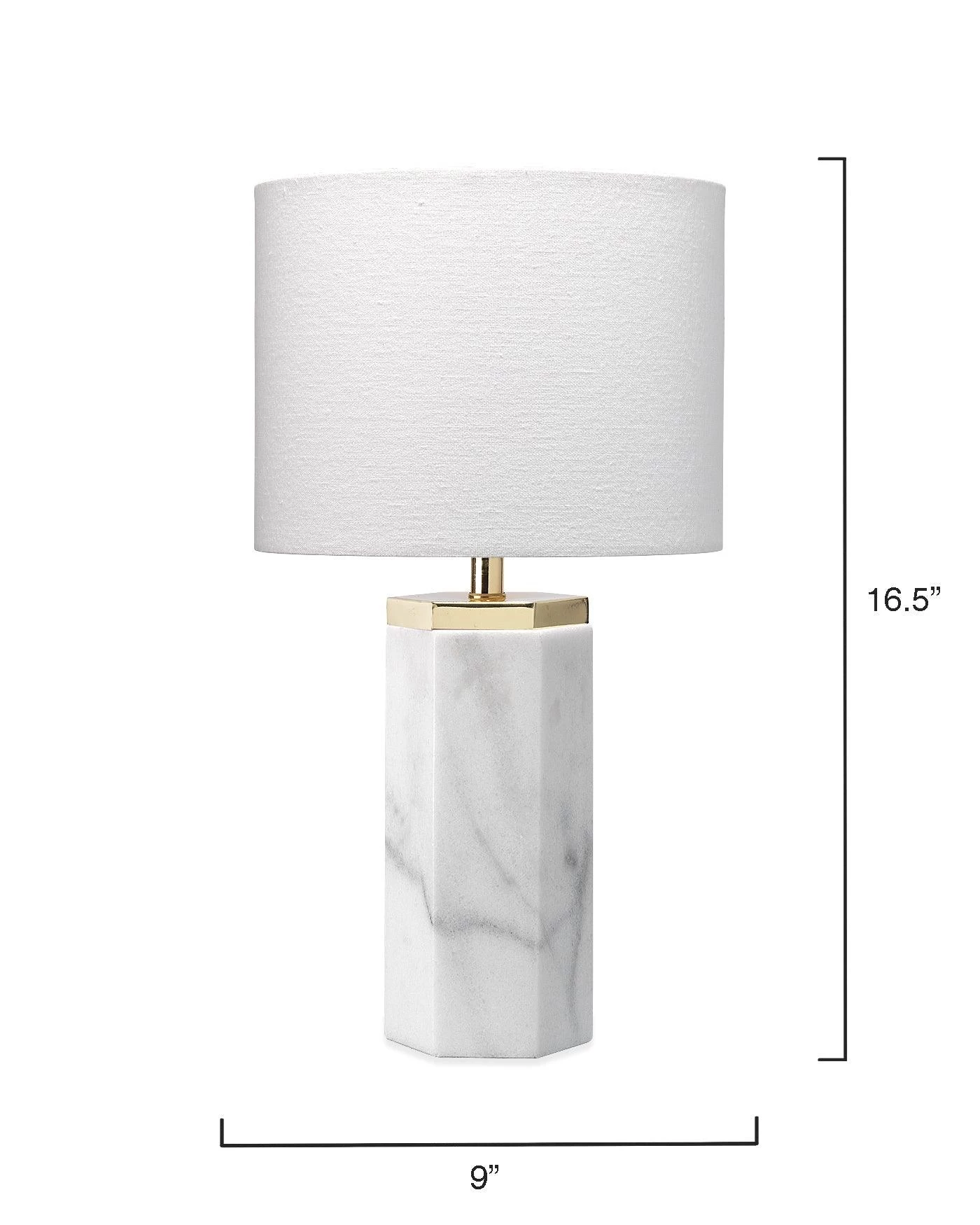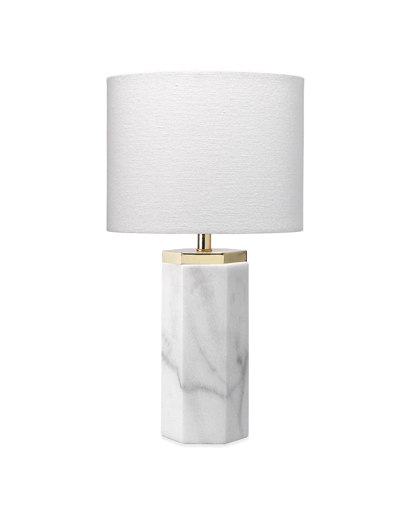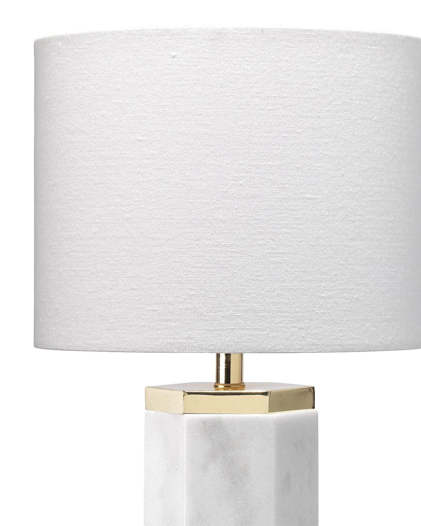 The balanced geometry of a hexagon in a slender white marble column of stunning simplicity, capped in antique brass makes for a perfect accent lamp.