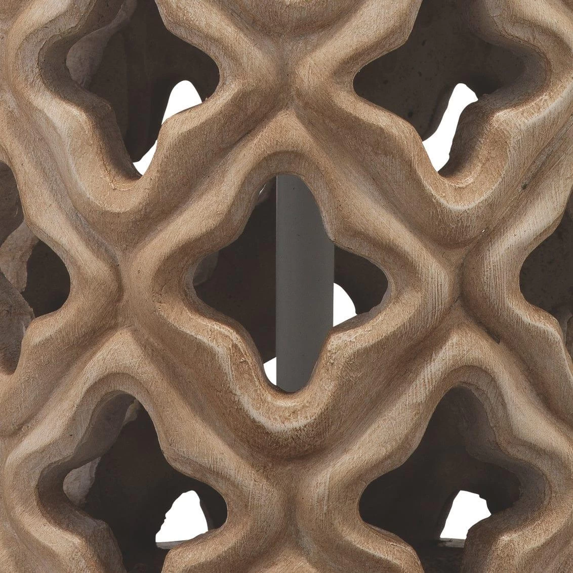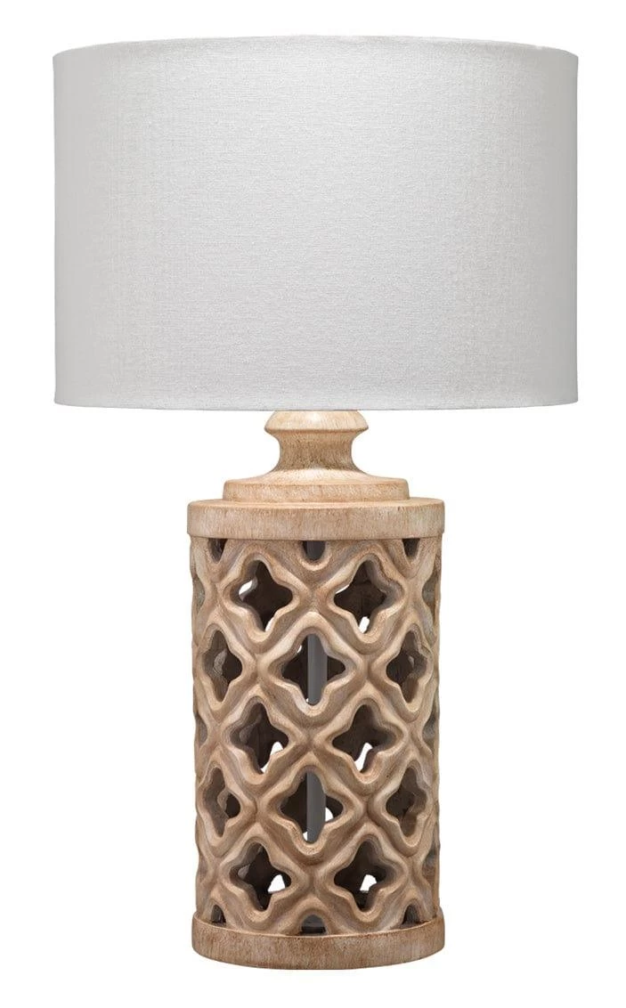The cut out pattern on this beige resin table lamp feels both masculine and feminine, perfect for most spaces. Finial and harp included. Lamp and lamp shade included.