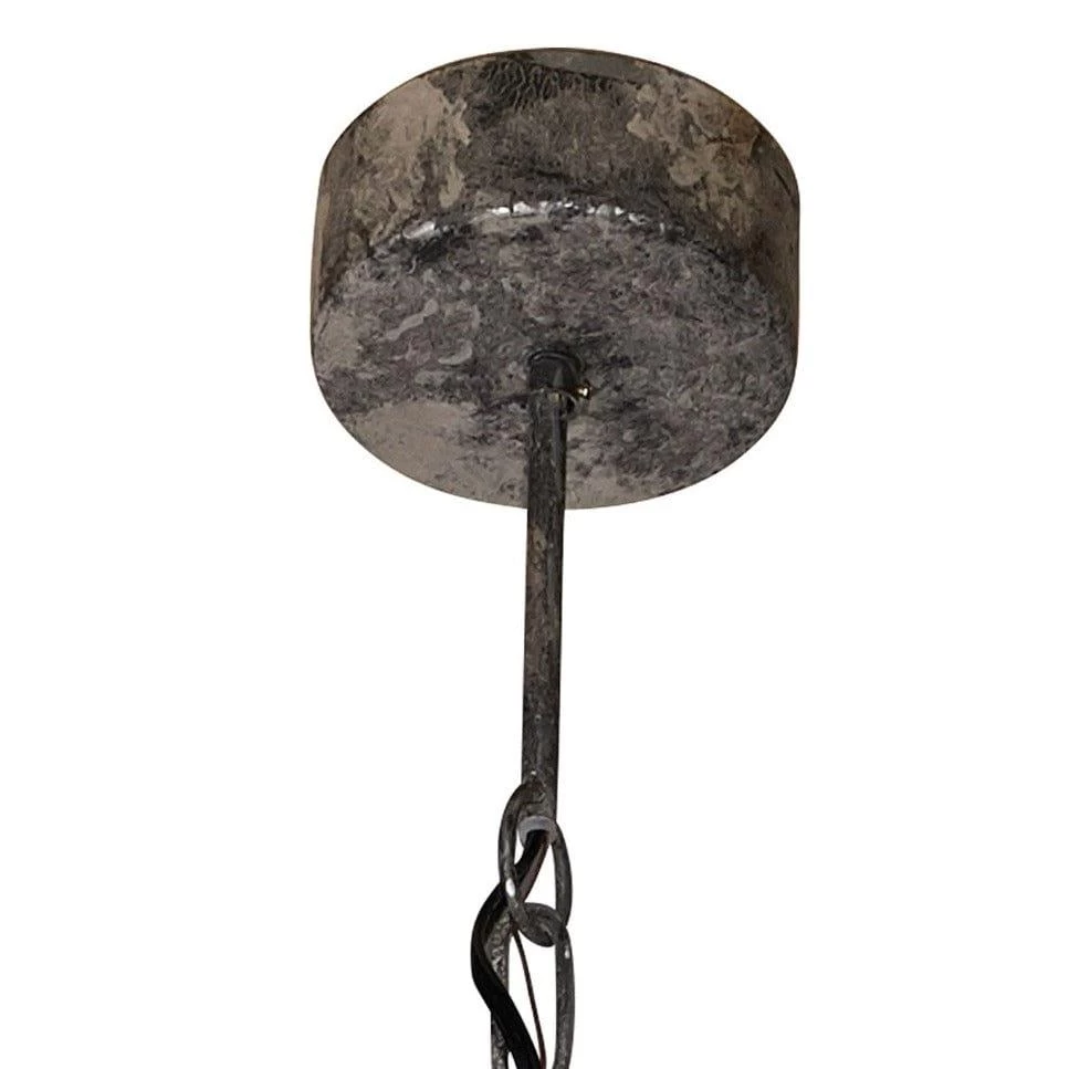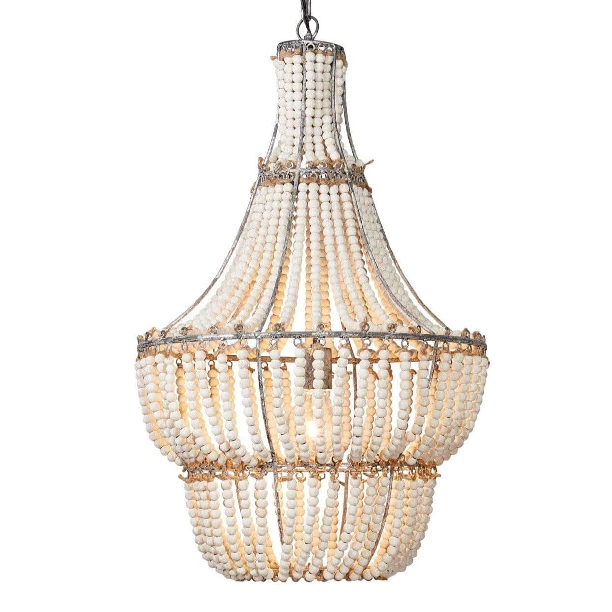 4 foot distressed chain with black cord. 5 inches diameter distressed metal ceiling plate. Glamourous and elegant this handmade chandelier is made of wood beads and antique white finish for the ultimate statement piece.